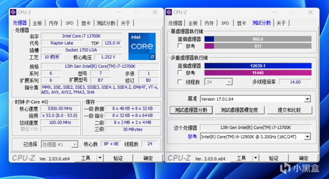 把主板BIOS刷至最新版本,开启XMP档后就可以进入系统测试了,13700K的CPU-Z规格如图,单核跑分865,多核跑分12639,完美超越上一代i9-12900K,玩游戏为主i7个人认为已经是天花板。