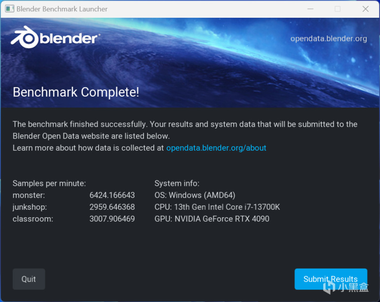 AX电竞叛客RTX4090 X3W在Blender中的Monster、Junkshop和Classroom三项采样成绩分别是6424、2959和3007