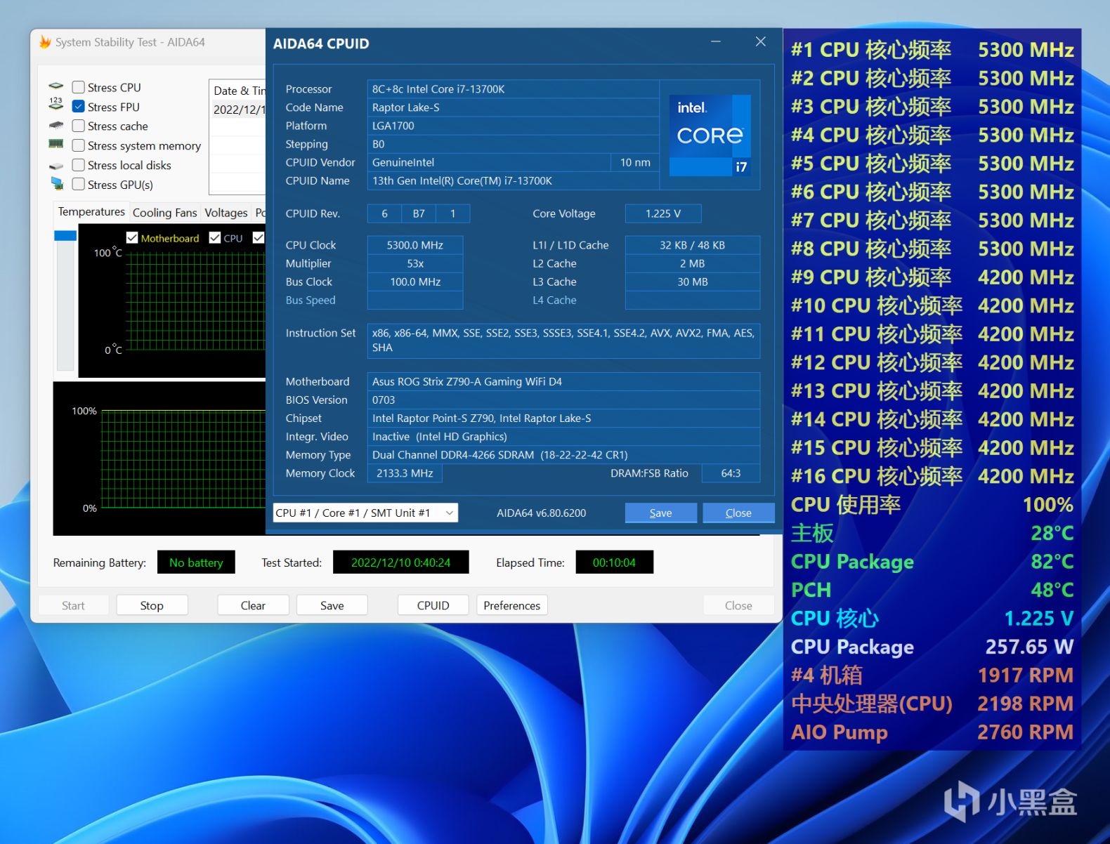 AIDA64 FPU单烤测试,吹雪360压制13700K默频还是妥妥的,P核心和E核心全程稳定在5.3GHz和4.2GHz,CPU Package温度最高仅为82℃,此时CPU功耗已经来到257W,CPU表显核心电压位1.225V。