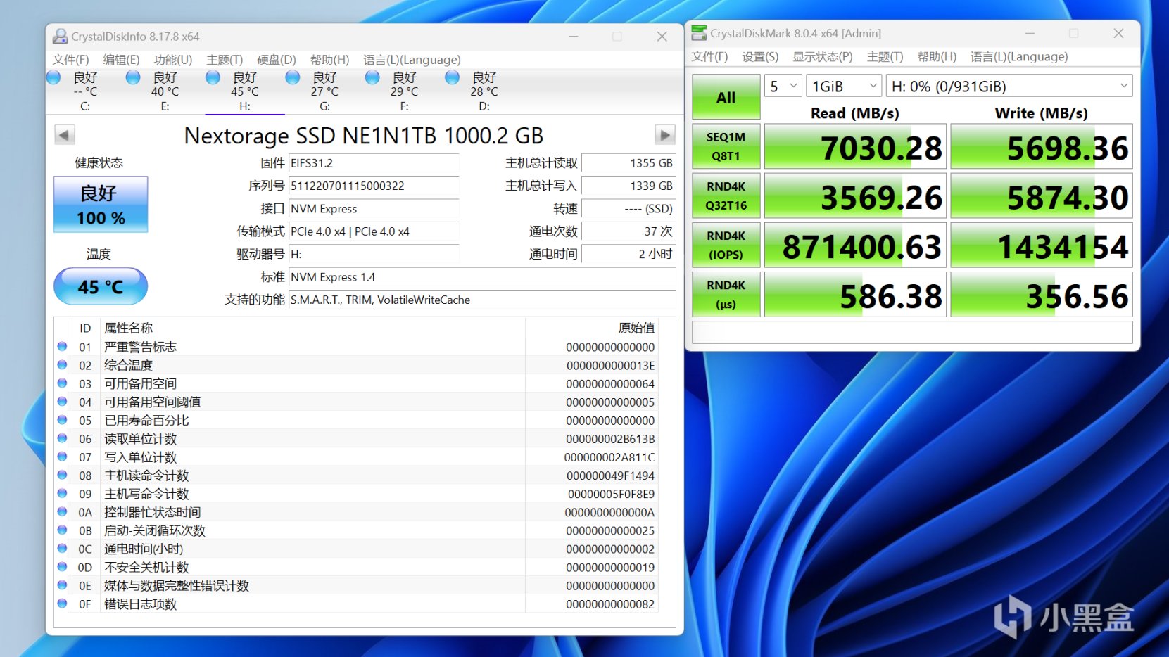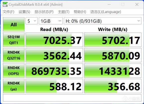 CrystalDiskMark峰值性能Q8TI测试,NE1N1TB的连续读取速度为7025.37 MB/s,连续写入速度为5702.17 MB/s,基本和官方标称相符,使用AMD平台就可以完全跑满,而4K随机读写为IOPS分别是869K和1433K,远远超过官方标称数据,其中4K随机写入速度表现突出,都快接近1500K了。