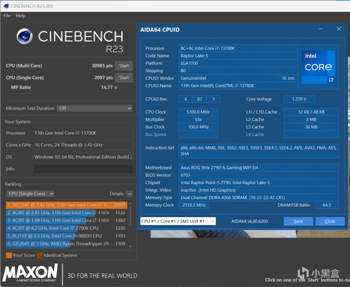 CINBENCH R23渲染项目跑分,单核得分2097 pts,多核得分30985 pts,i7-13700K对于一些预算有限、对生产力性能有要求的游戏玩家也友好,当然如果你主要是搞生产力性能的话,这个价位更建议选择Ryzen 9 7950X。