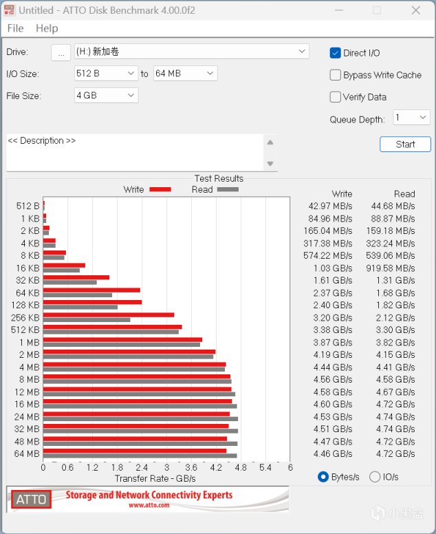 ATTO Disk Benchmarks QD1性能测试,设置文件大小为4GB,最高峰值的读写可以达到4500 MB/s以上,而对于0.5KB的这种小文件,NE1N1TB也能保持44MB/s左右的读写性能,整体来看符合群联PS5018-E18这款主控的性能表现。