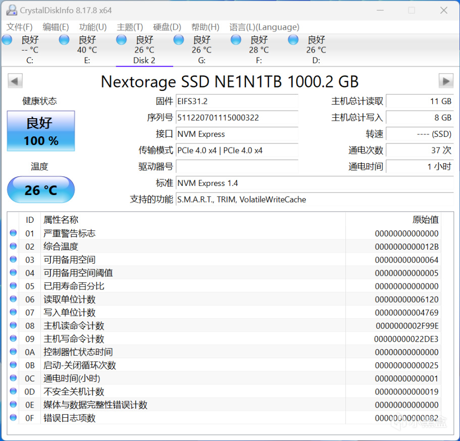 使用CrystalDiskInfo检测一下SSD信息,这款Nextorage G系列型号为NE1N1TB,支持NVME 1.4协议、S.M.A.R.T和TRIM等功能,已经成功运行在PCIe 4.0x4接口,在散热片加持下待机温度仅为26℃。