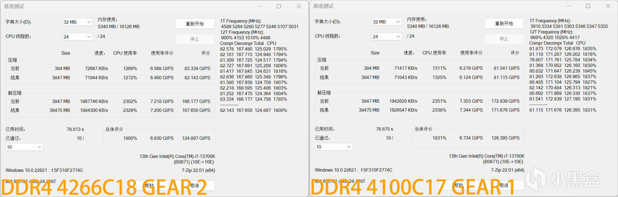 优化前后7-ZIP基准测试对比,DDR4 4100 Gear 1相比DDR4 4266 Gear 2,主要提升在解压缩方面,在日常对于文件的处理最常见就是解压缩了,当然效果不会太明显。