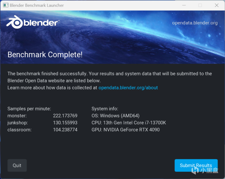 i7-13700K CPU运算模式,在Blender中的Monster、Junkshop和Classroom三项采样成绩分别是222、130和104