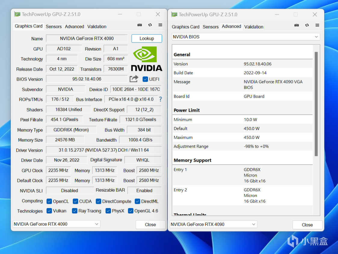 GPU-Z规格一览,AX电竞叛客RTX4090 X3W标称Boost频率达到2580MHz,比公版设计要高一些,但是其默认功耗默认为450W,最高也只是450W不能解锁,同时测试会开启Resizable BAR技术为显卡提升一些性能。