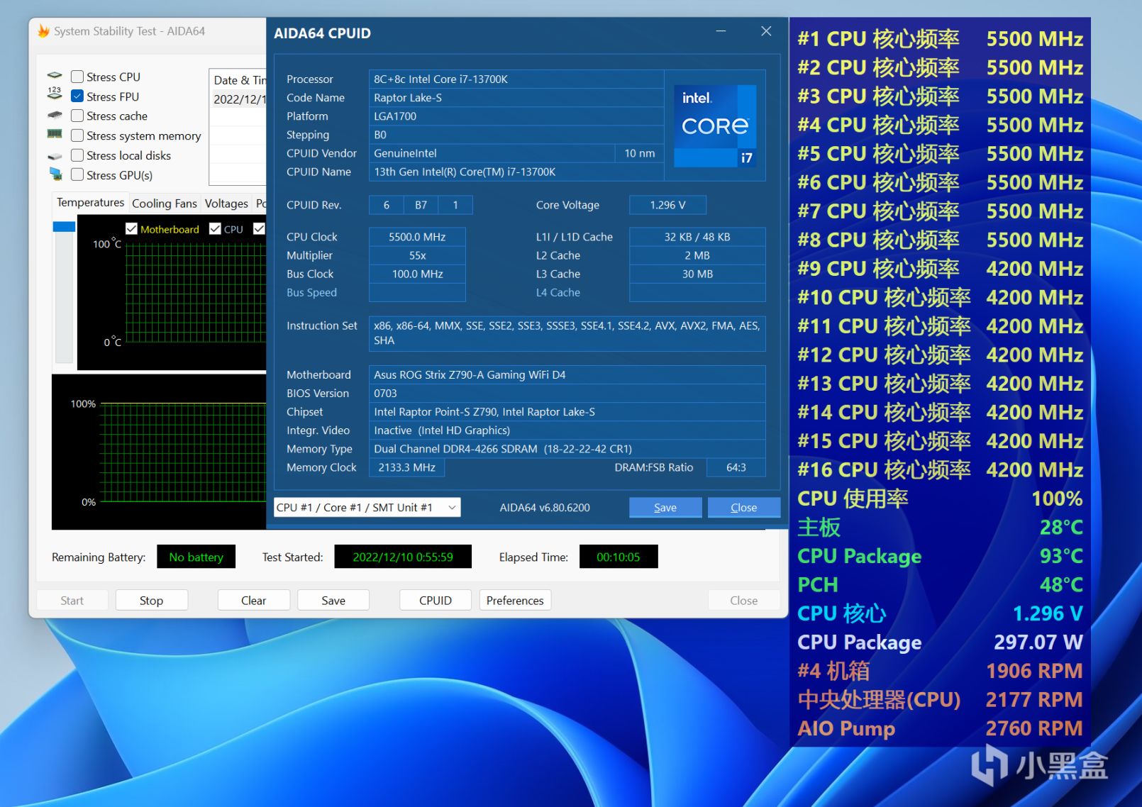 13700K+Z790 D4吹雪使用AI优化后, AIDA64 FPU单烤测试,P核心能稳定5.5GHz,此时CPU温度和CPU功耗也不低,一般这种重载情况只针对生产力用户,能手动超频最好,毕竟性能释放可以更好。