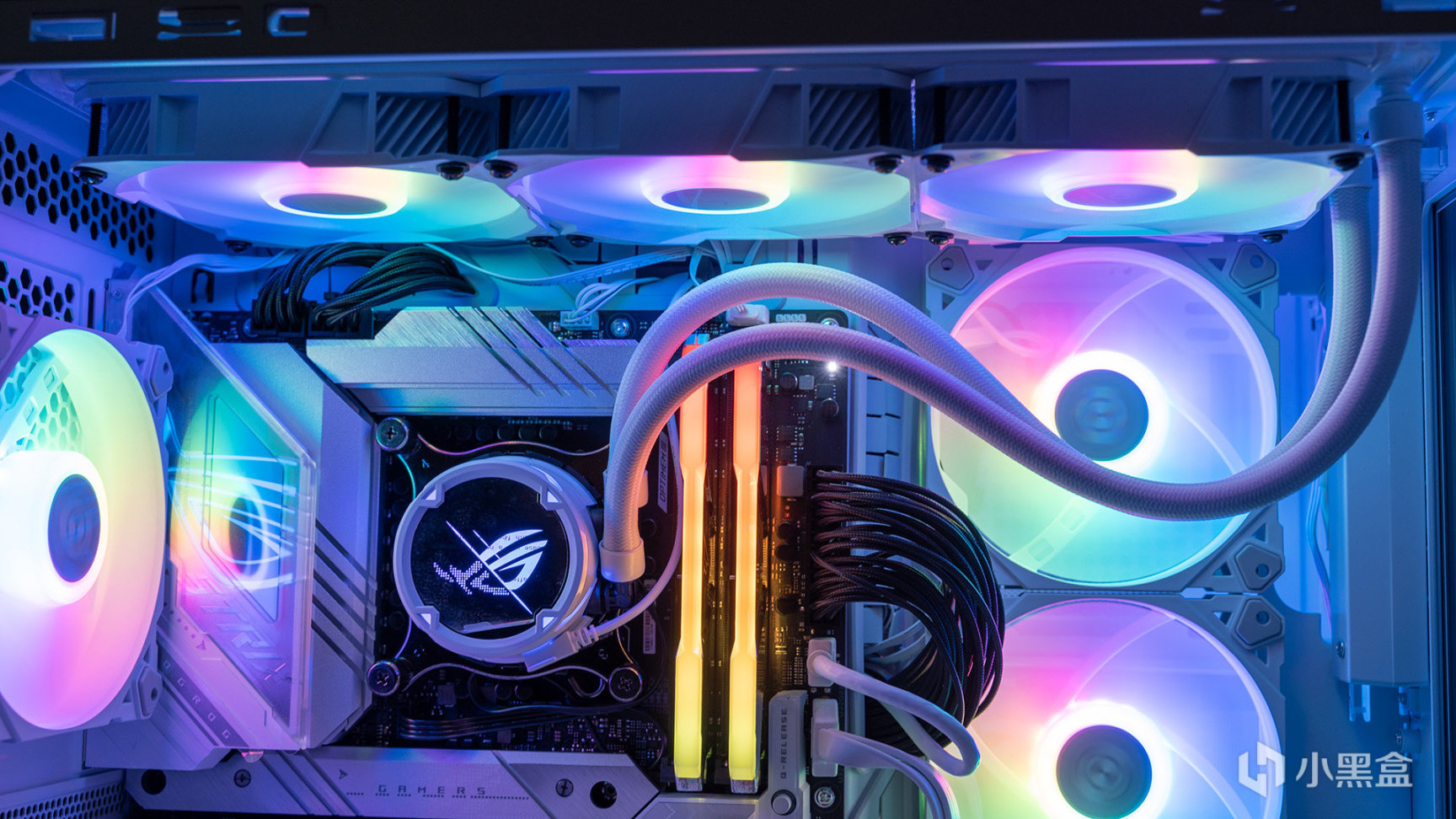 其冷排风扇是三枚ROG 120MM ARGB定制版,散热性能非常暴力,它的最高转速可达到2500 RPM±10%,所以CPU满载噪声肯定高一些,不过对于游戏为主、小型内容创作为辅的需求来说,CPU满载的机会并不多。