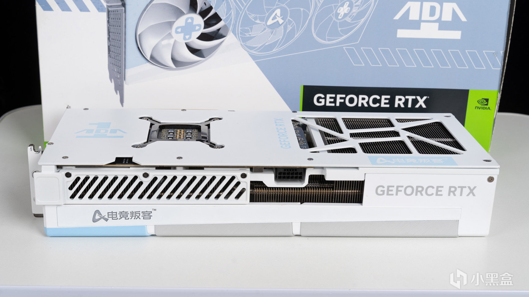 侧面区域设计要素比较简洁,电竞叛客RGB LOGO灯,可自动轮换色彩,右侧还是比较熟悉的GEFORCE RTX,值得一提的是,侧面靠左位置的设计并不是什么通风栅栏,而是隐形显卡金属支架设计,可以支撑显卡重量,再也不需要第三方支架,显卡也不会显歪。