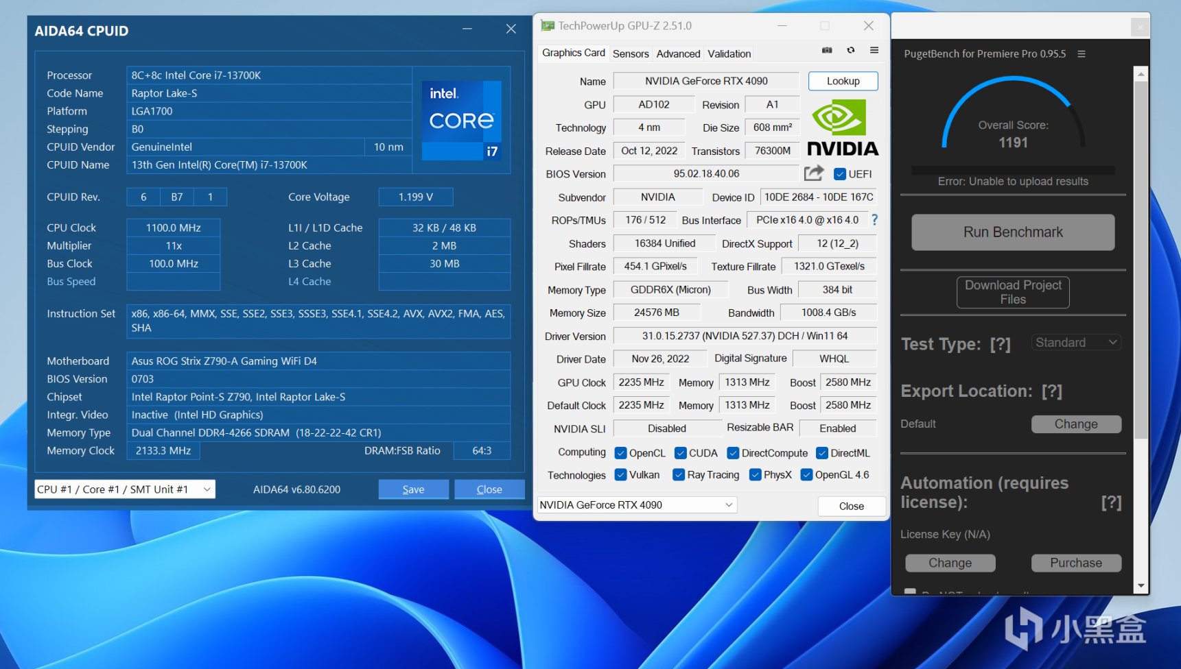 PugetBench for Premiere Pro基准测试,13700K+RTX4090+DDR4 4266 8GBX2跑分为1191,相比DDR5平台确实分数会低一些,16GB容量比较鸡肋,不过对于硬核这种轻度视频剪辑(最高也就4K,码率也不高,素材也不多)来说已经是足够了。