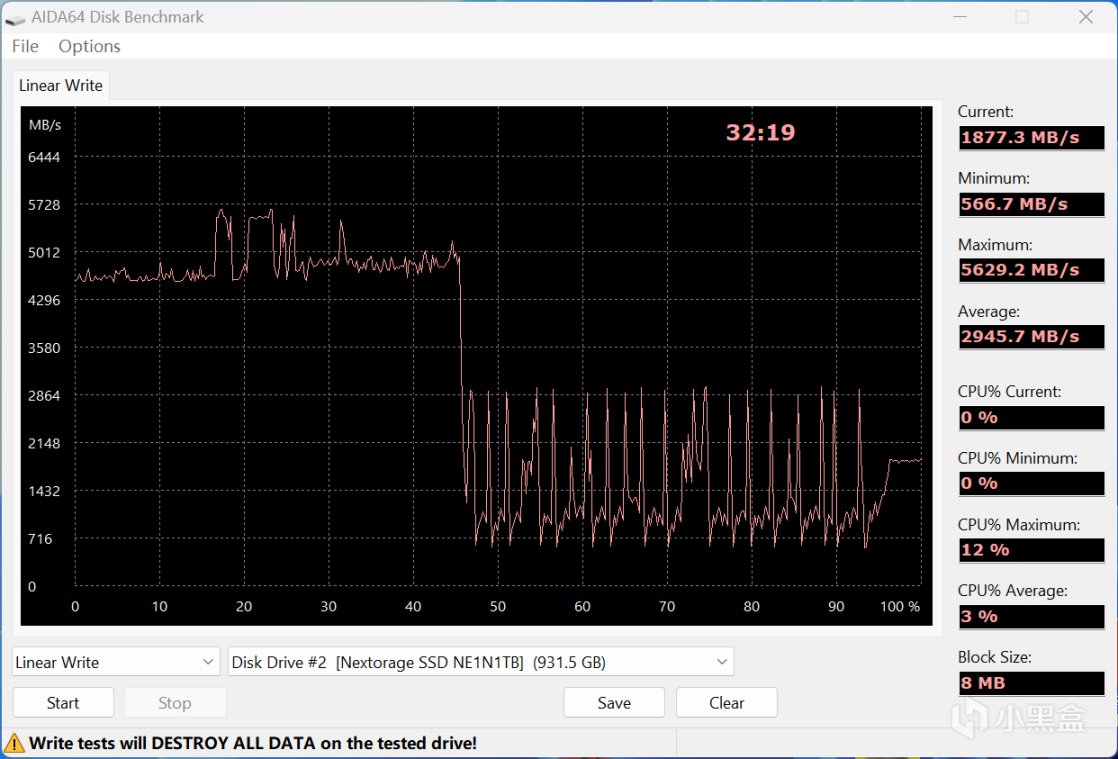 使用AIDA64进行SLC Cache全盘写入测试,在模拟SLC Cache的时候,初期写入速度可以达到4600 MB/s左右,中间会有一段间歇飙升至5600 MB/s左右,最后一段比初期高一些达到4800 MB/s以上,空盘时能提供大概420GB的SLC缓存空间,耗尽以后调教依然不错,并不会断崖式直接掉速,而是基本呈波浪式,缓外平均速度为2945.7 MB/s。