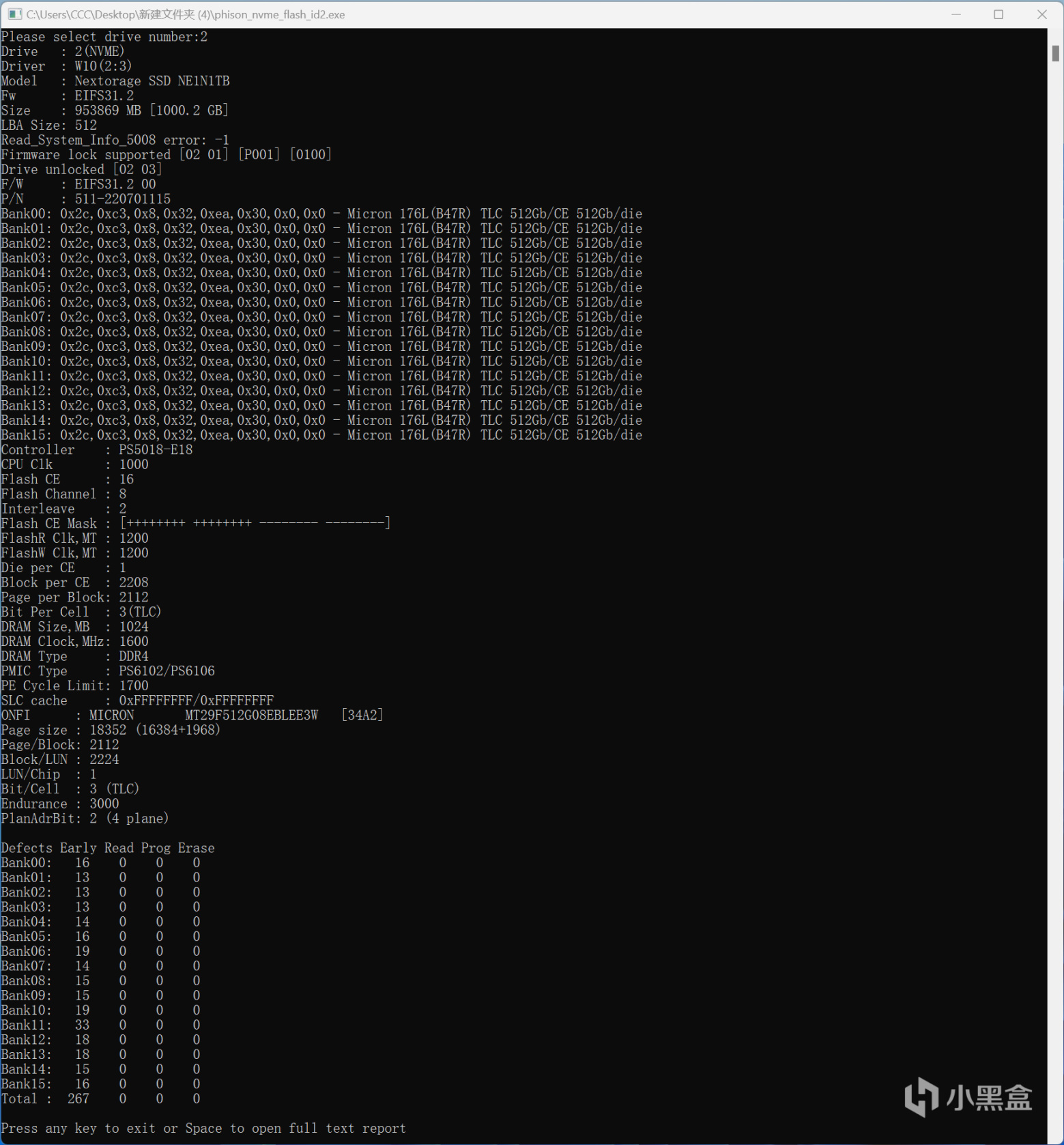 Nextorage G系列的主控是自家打标的,只要通过FLASH ID就能查到是群联PS5018-E18,采用了最新的台积电 12nm工艺,8通道设计,是目前比较常见的PCIe 4.0顶级主控,缓存颗粒为海力士H5AN8G6NDJRXNC,采用DDR4 3200频率,1TB版本就提供1GB容量缓存,闪存颗粒则是176层3D TLC美光B47R,型号为IA7BG94AYA,单颗容量256GB,四颗组成1TB容量。