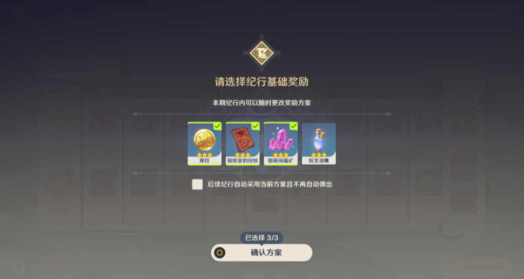 此外,俗稱“大月卡”的紀行也被大幅優化,增加了每日委託的經驗獎勵及任務種類,讓紀行的完成速度有所增加,同時調整大量獎勵爲自選,讓紀行更加靈活的滿足旅行者的不同需求。