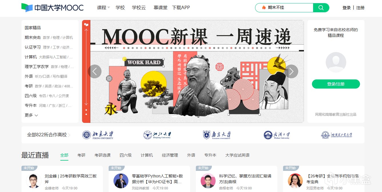 點擊網站的課程版塊,可以看到它把所有課程分爲 6 大類;包括:綜合素養、通用能立、成長基礎、公共必修、創新創業、考研輔導。