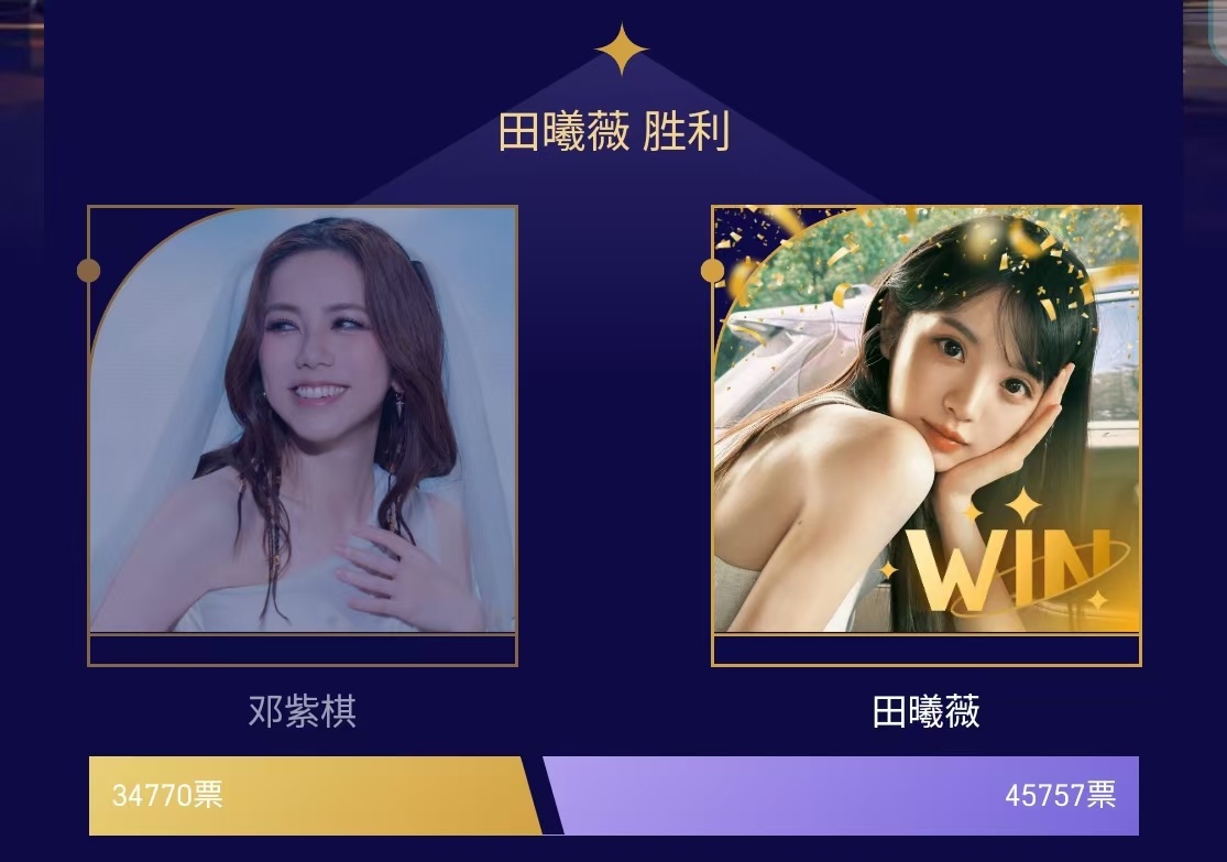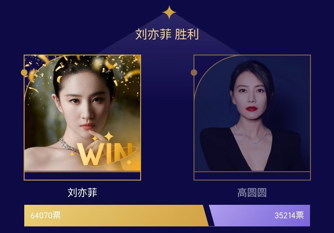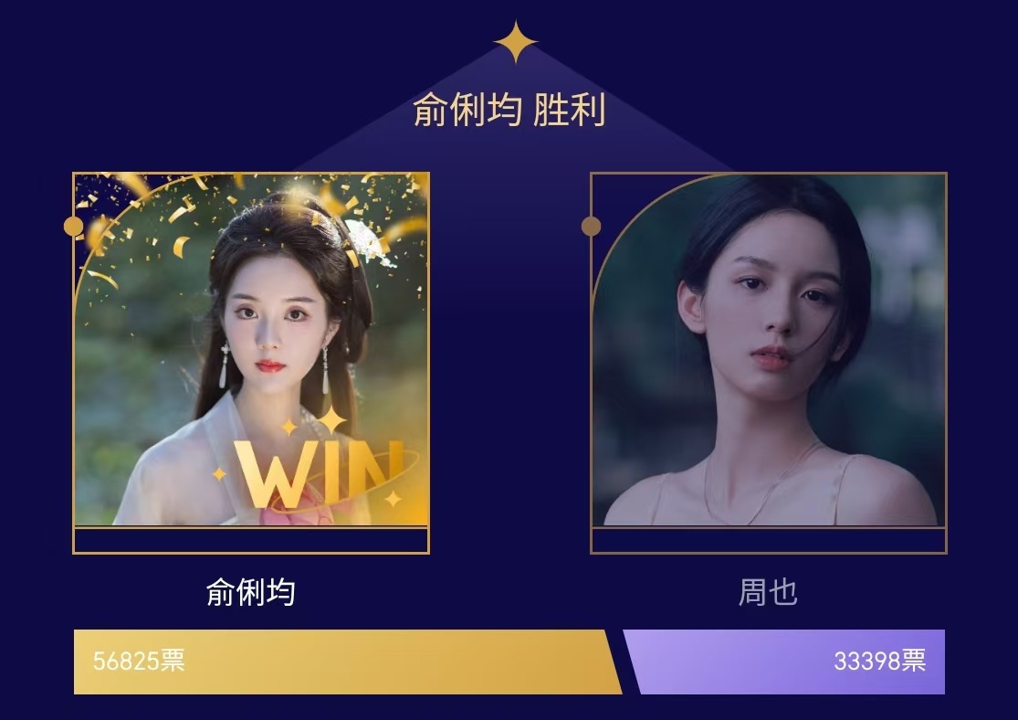四强名单:章若楠,刘亦菲,俞俐均,田曦薇。其中,得票最多的为章若楠,其次是刘亦菲。