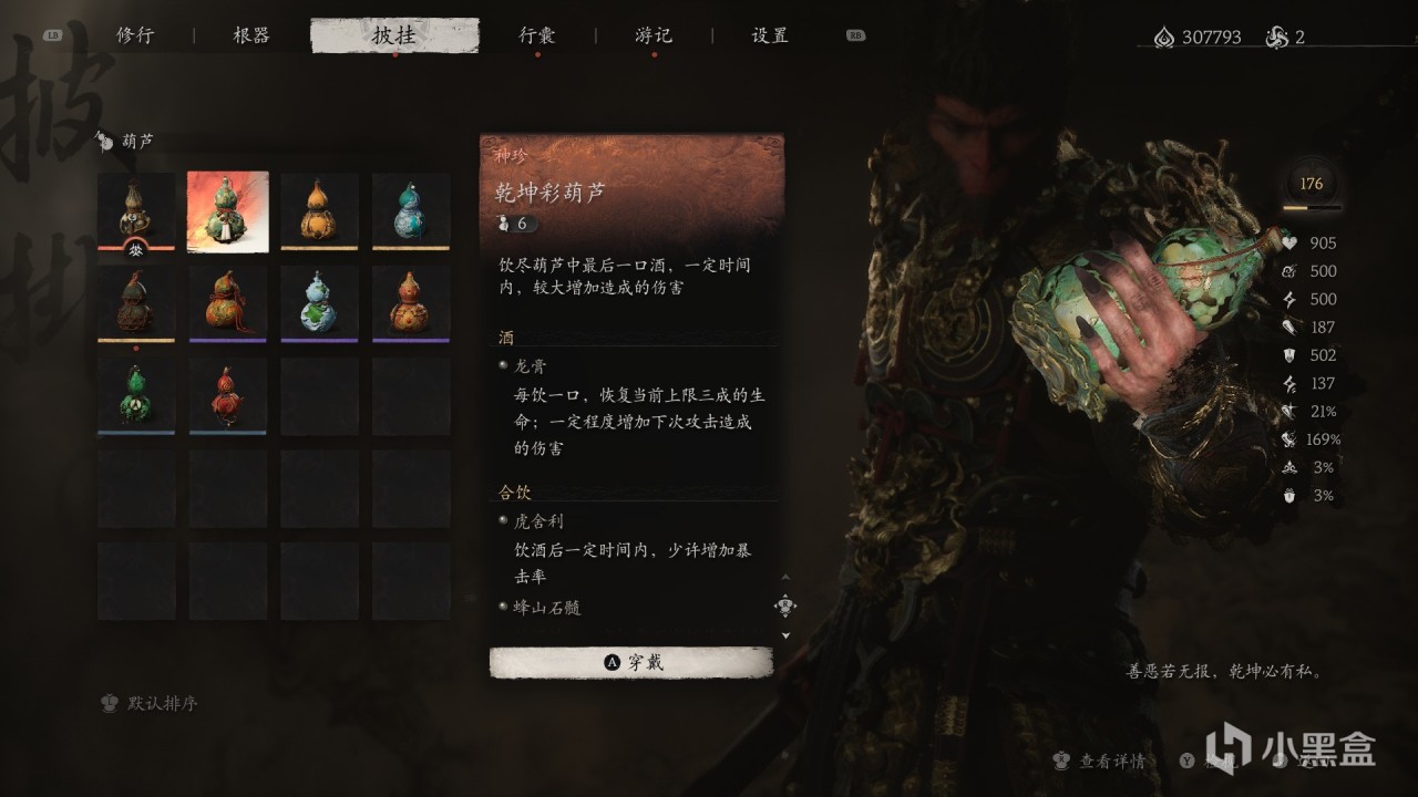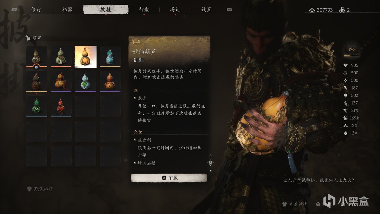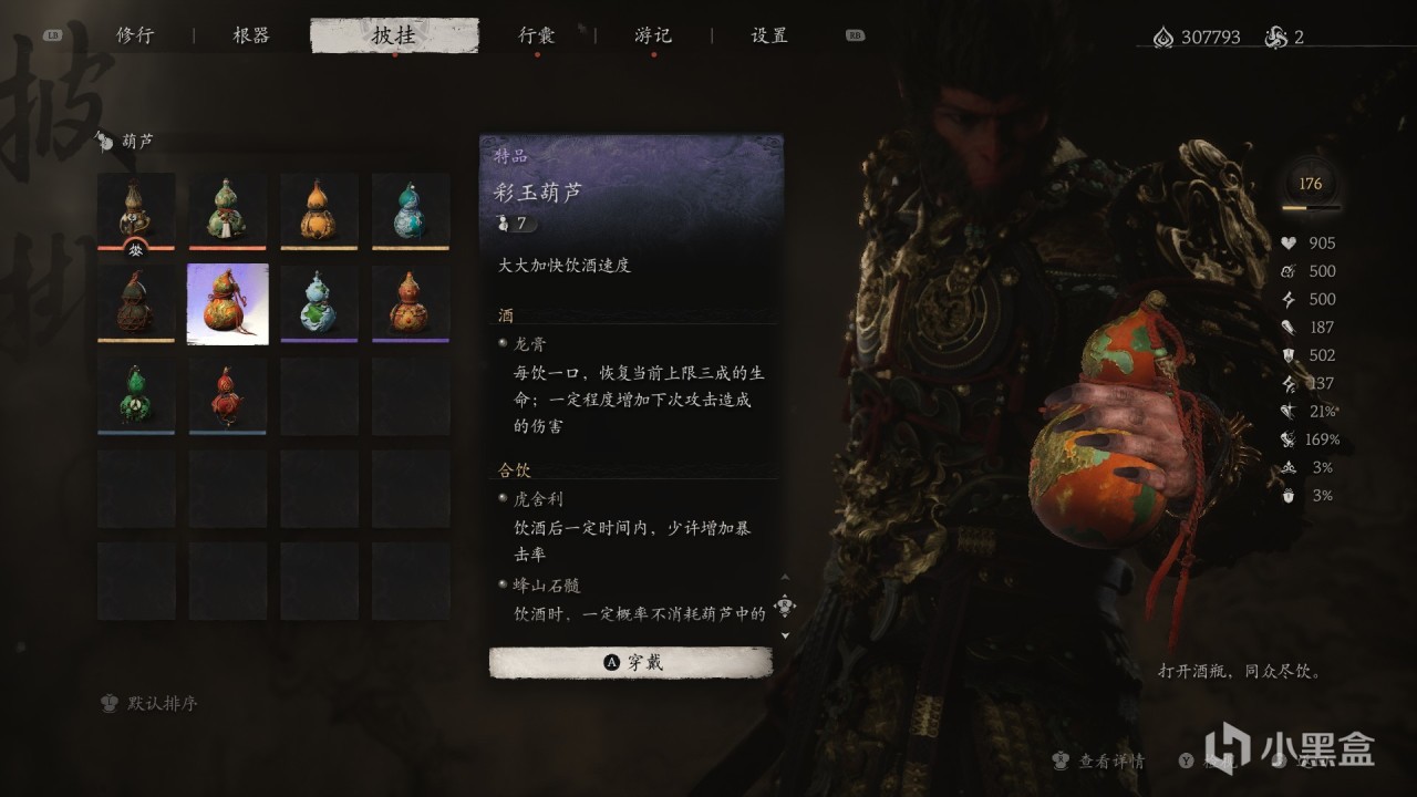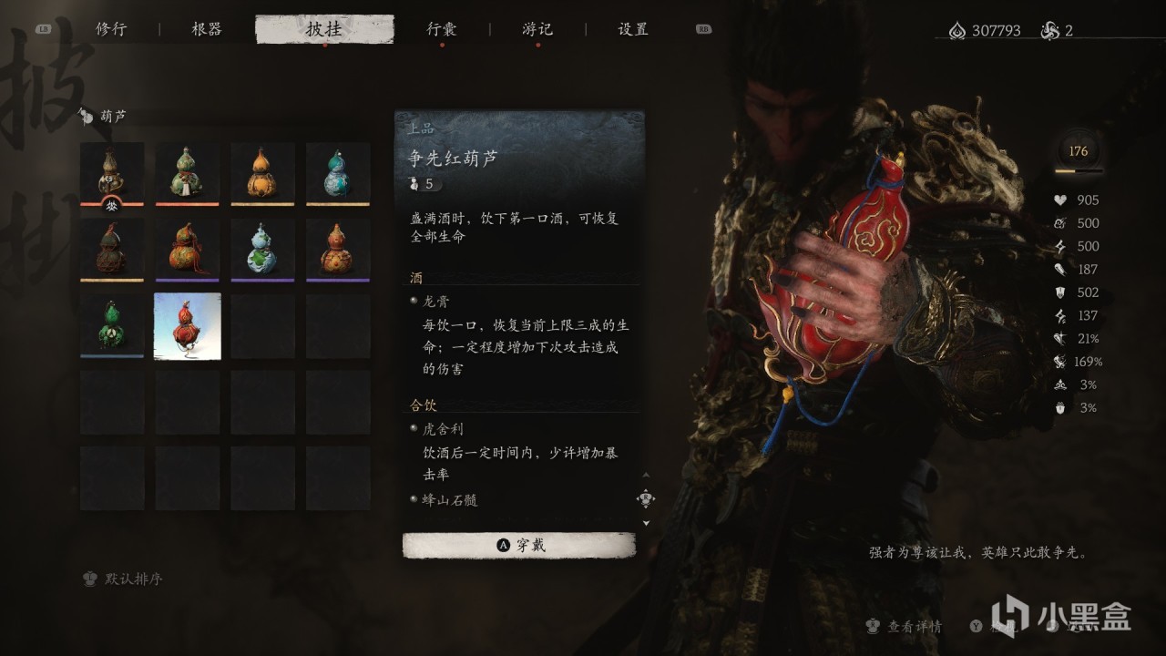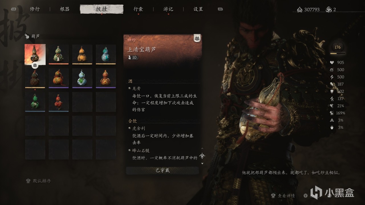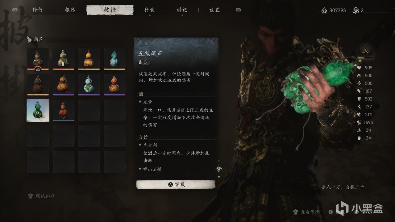 特殊效果:飲盡葫蘆中【最後一口酒】,一定時間內,【較大增加造成的傷害】。