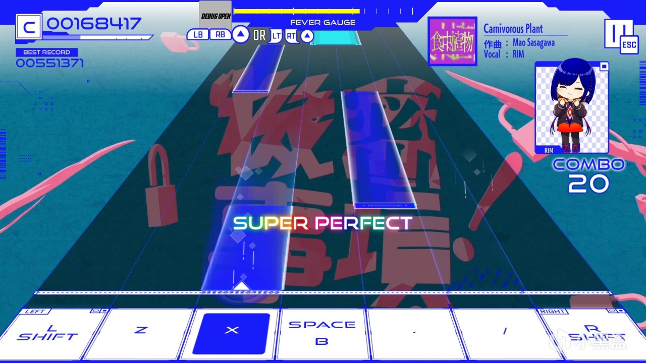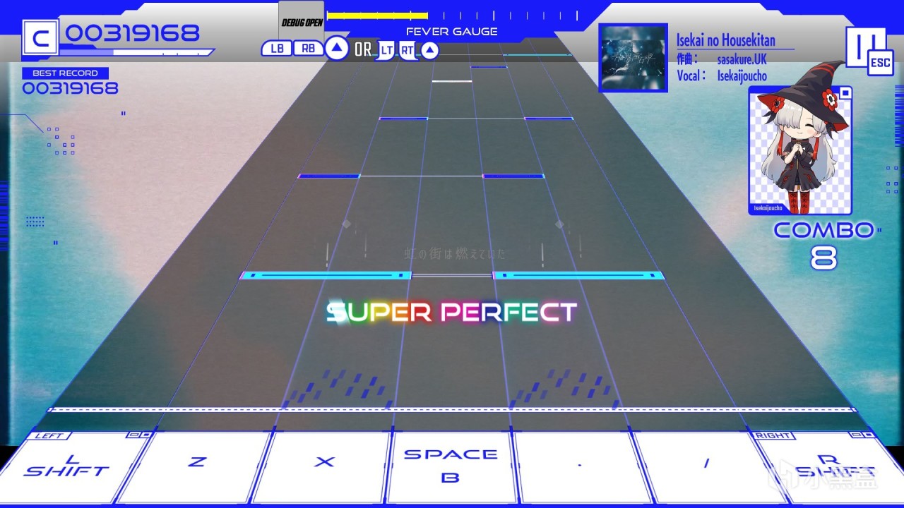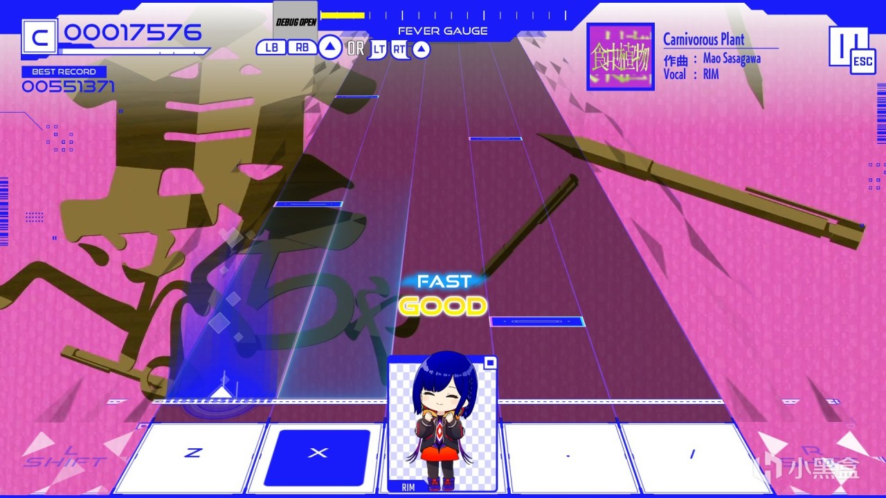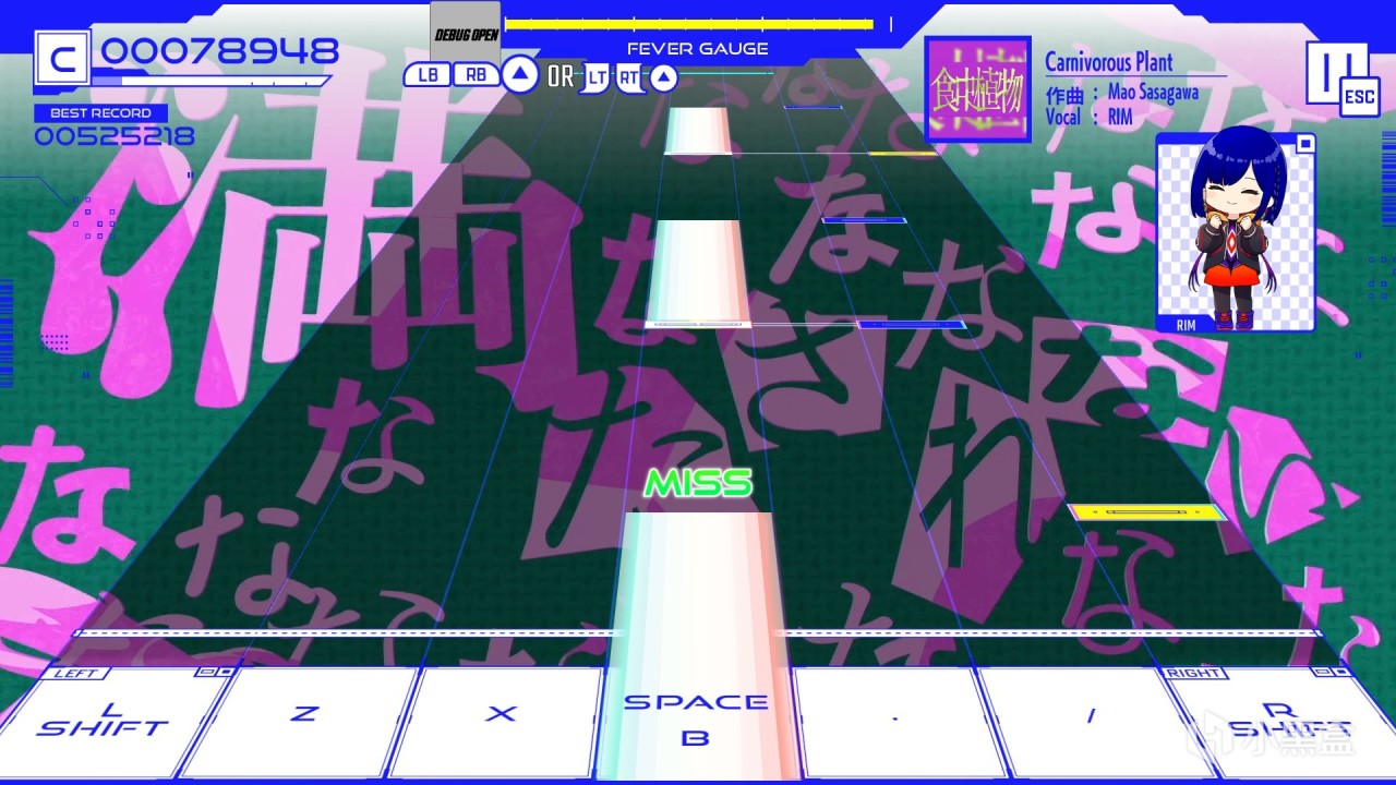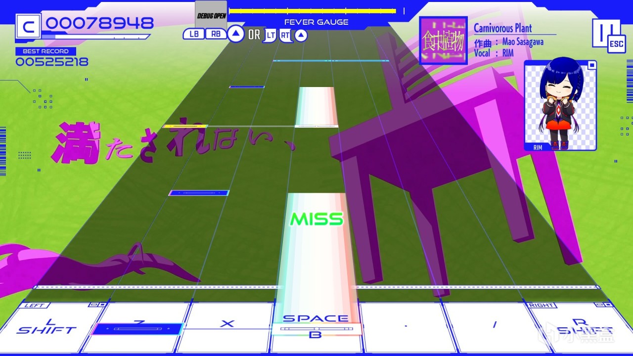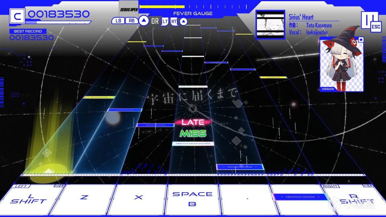 打譜的界面和大多數下落式的音遊幾乎別無二致(左上角記錄樂曲得分,右上角曲名,中間記錄當前判定,可以忽略頂上debug,這個爲測試版用的,正式版不會出現)