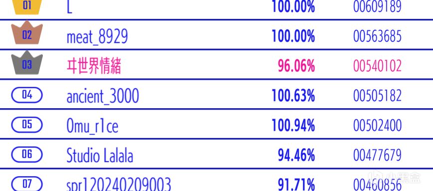 在結算畫面會有best record和達成率以及最大combo反饋,對於全球排行榜的排列是參考得分的,而達成率是計算方式我也不知道 T v T
