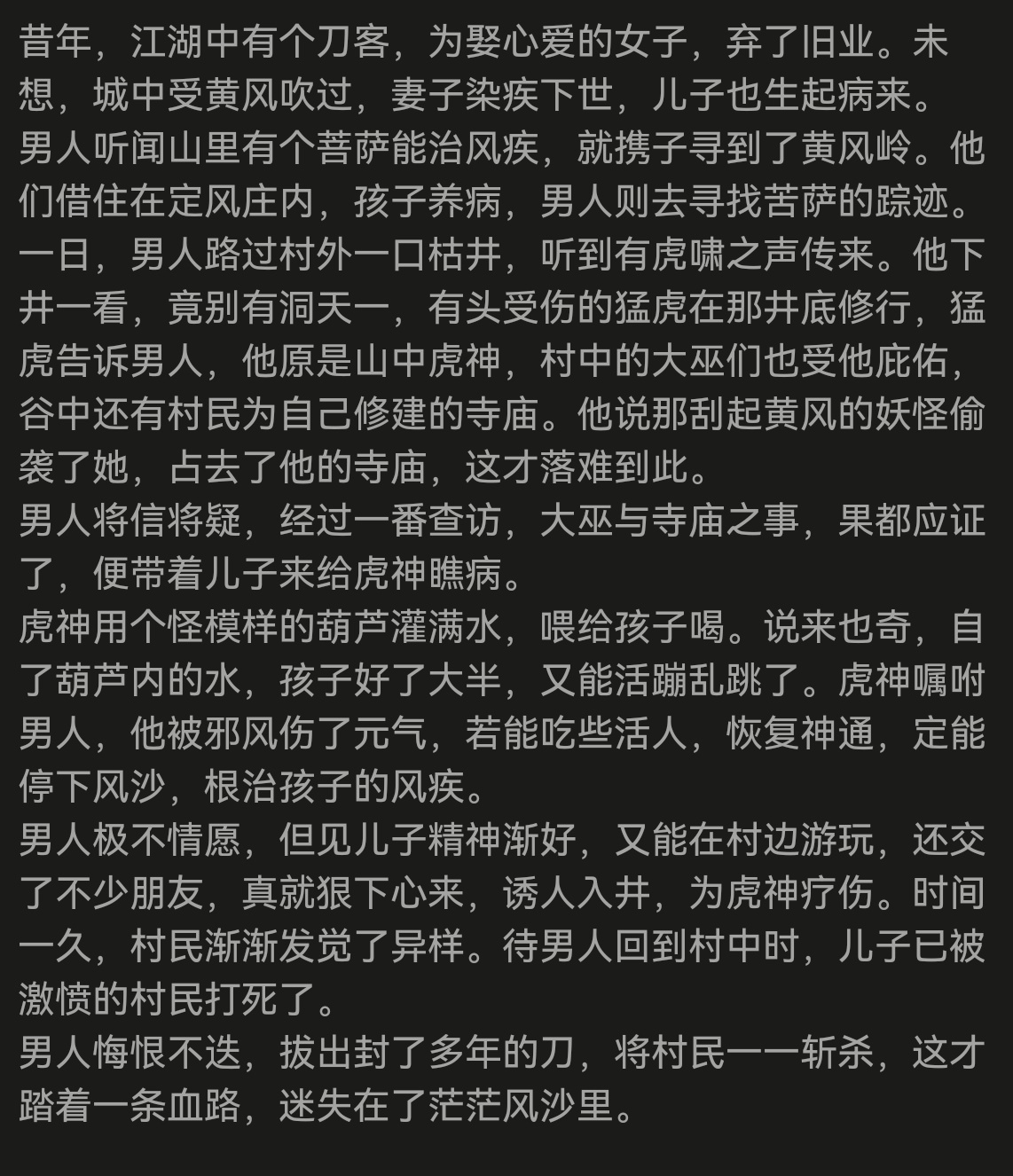 黃風大聖在黃風嶺修煉三昧神風,路過的人也苦不堪言,有小孩受到三昧神風影響,其父四處求病,發現藏在井底的虎弟,而虎弟有一葫蘆,可救治此孩,於是爲了報答救治之恩,便引誘村民下井,最終人們發現不對勁,就棍殺了這個孩子,父親悔不當初,屠殺整村的村民,消失在風沙之中…