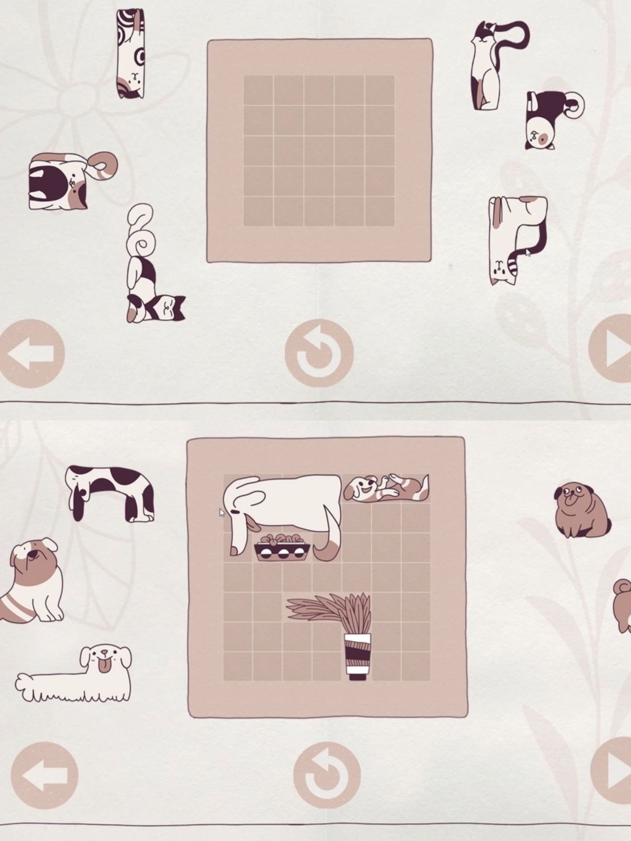 悠闲拼图游戏 。将各种姿态的小猫/小狗通过旋转的方式完整的拼满格子,每次点击小猫/小狗都有对应喵喵/旺旺叫,好评!