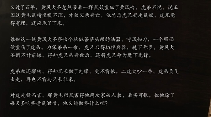 但是这样的做法让虎弟“疯虎”很嫉妒,他非常讨厌哥哥!而且他也很讨厌“黄风大圣”,他认为哥哥和“黄风大圣”都是坏人!一个是抢自己供奉一个是杀父凶手!