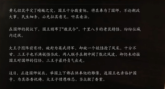 国王大喜,直接封“黄风大王”为“黄风大圣”,为“斯哈哩国”的国师!整个国家也开始供奉鼠像,不信“佛”,不信“王”,信“鼠”!周围的“鼠妖”都迁徙到此地跟随“黄风大圣”!