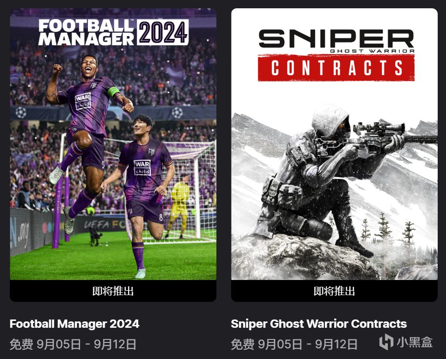下一周赠送的免费游戏为《足球经理2024》和《狙击手:幽灵战士契约》,领取时间9月5日~9月12日