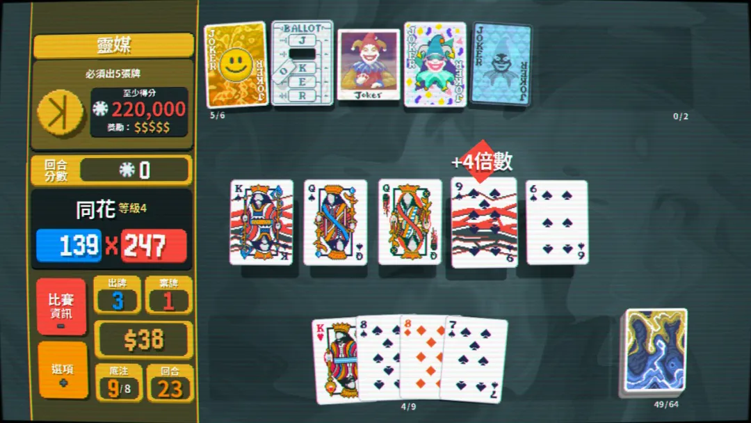 通过舍牌和抽牌组出高分组合,利用牌型/花色基本分+各种功能卡牌,打出超高的分数点。