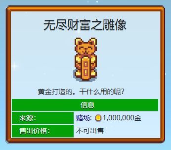这个雕像是游戏中最贵的物品之一,也是获得铱锭的最简单方法之一,但是其产出并不匹配它高昂的价格。