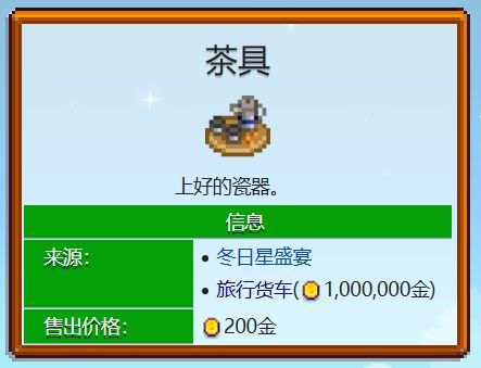 (二)来源:茶具是一种家具,在冬日星盛宴进行秘密礼物交换时有一定概率获得。除了克林特、艾芙琳、马龙、罗宾和威利以外的任何成年的村民都可能会送你茶具。
