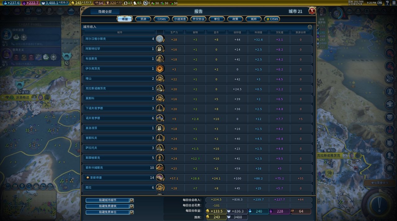 【說明】:該mod可以直觀的看見玩家所擁有城市的數量、城市擁有的區域建築、資源以及收益等具體城市信息彙總報告。同時,對城邦擁有界面與外交、發電情況等也做了便捷的優化。