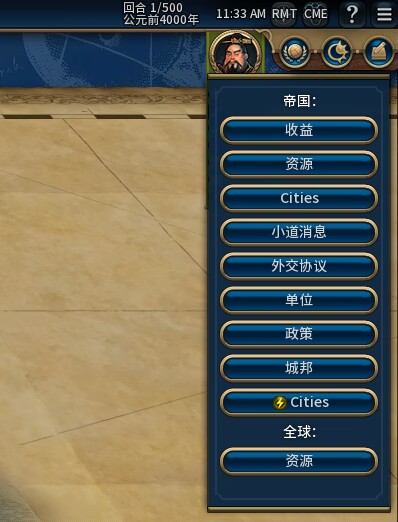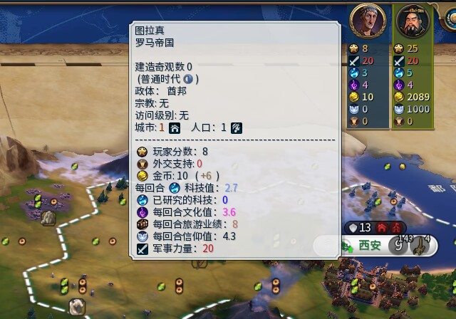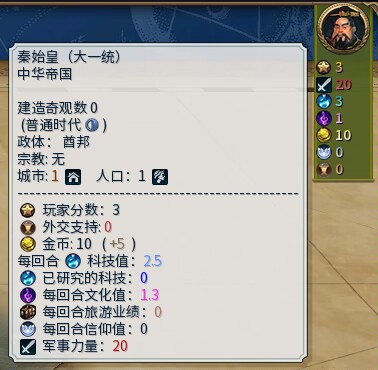 【說明】:將鼠標懸停在ai頭像上,則可顯示ai詳細外交信息。包括所處時代/政體/城市數量/人口/回合金/回合信仰/科琴產值以及軍事實力等等數據。
