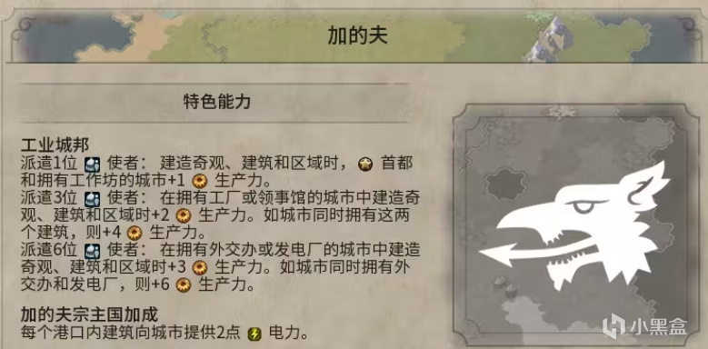 加的夫宗主國加成:每個港口內建築向城市提供2點電力。