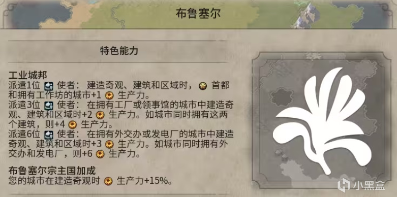 布魯塞爾宗主國加成:您的城市在建造奇觀時生產力+15%。
