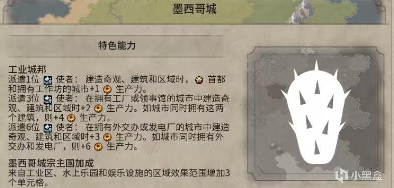 墨西哥城宗主國加成:來自工業區、水上樂園和娛樂設施的區域效果範圍增加3個單元格。