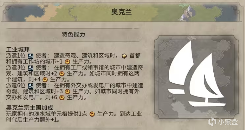 奧克蘭宗主國加成:玩家擁有的淺水域單元格提供1點生產力。到達工業時代後生產力額外+1。