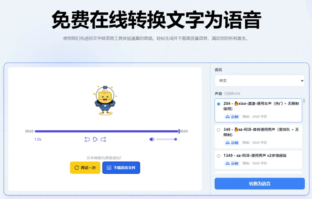 有了这个在线转换工具,以后就不用再为此花钱了,这个工具内置了超多不同的人物声音和语言,完全免费,主打的就是个良心。
