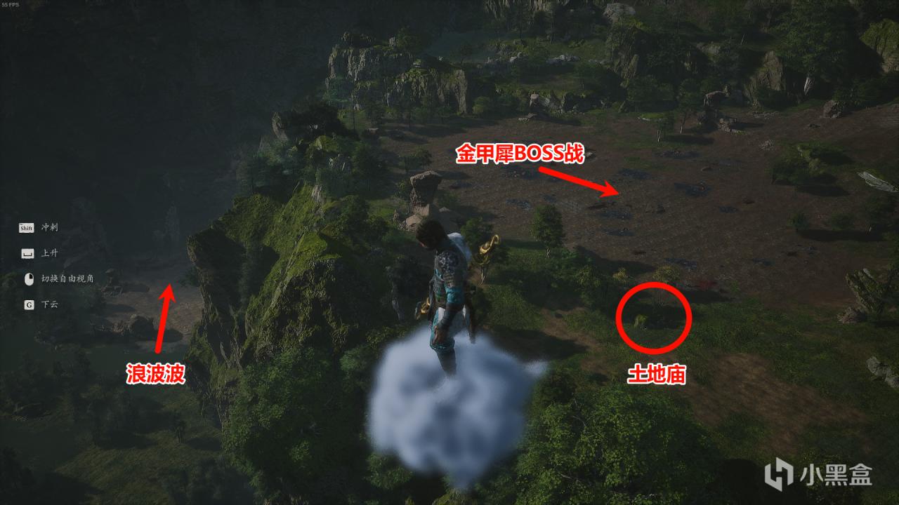浪波波BOSS戰:如下圖,望犀坡左前方懸崖下有塊空地,飛行靠近自動被打下筋斗雲觸發浪波波BOSS戰。這是全地圖最後一個青蛙,擊敗後能把青蛙精魄升級到紅色神珍品質。但是材料【小活師】不是百分百掉落,所以一週目不一定能升滿。