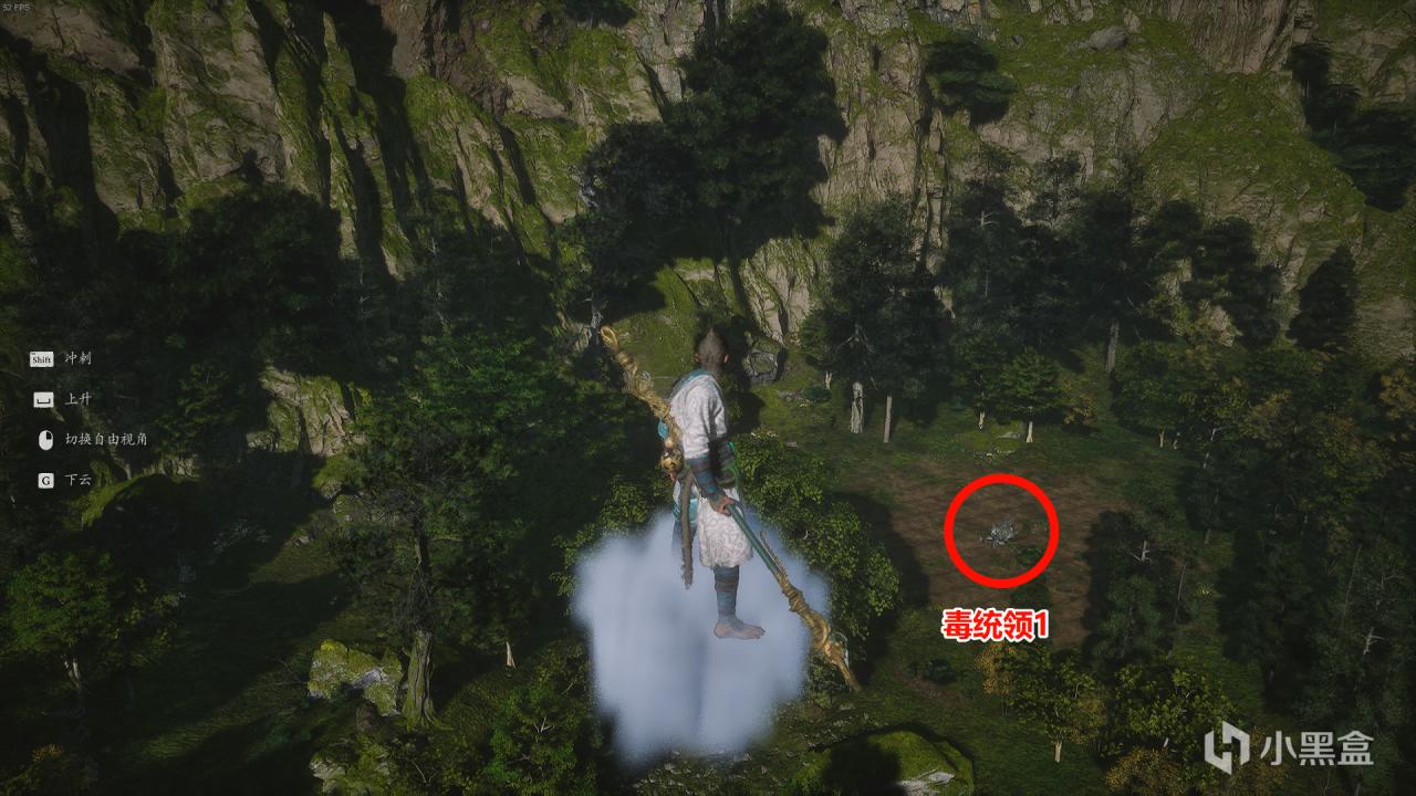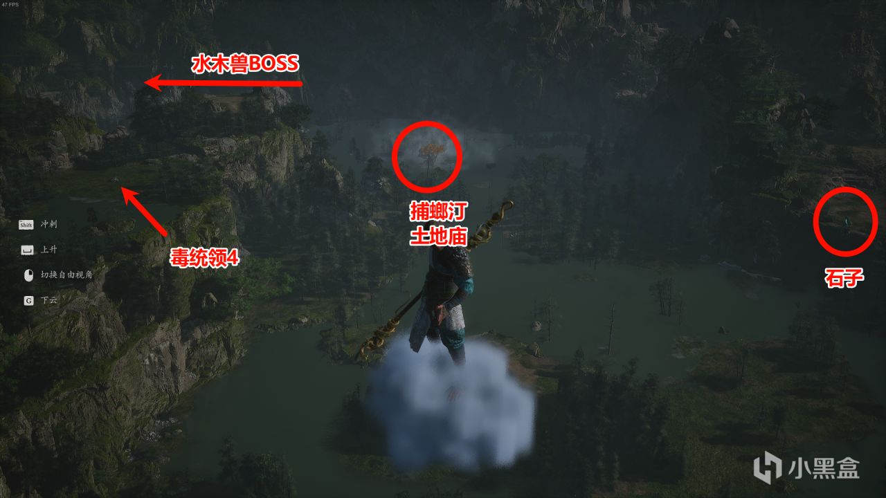 飛到山谷中間位置,看向左山谷,如下圖。正前方黃葉巨樹就是捕螂汀土地廟,右邊能看到發光石頭人石子,左邊箭頭指向的高地中央是最後一個毒統領4。飛過捕螂汀左轉盡頭的水池裏還有個水木獸BOSS。