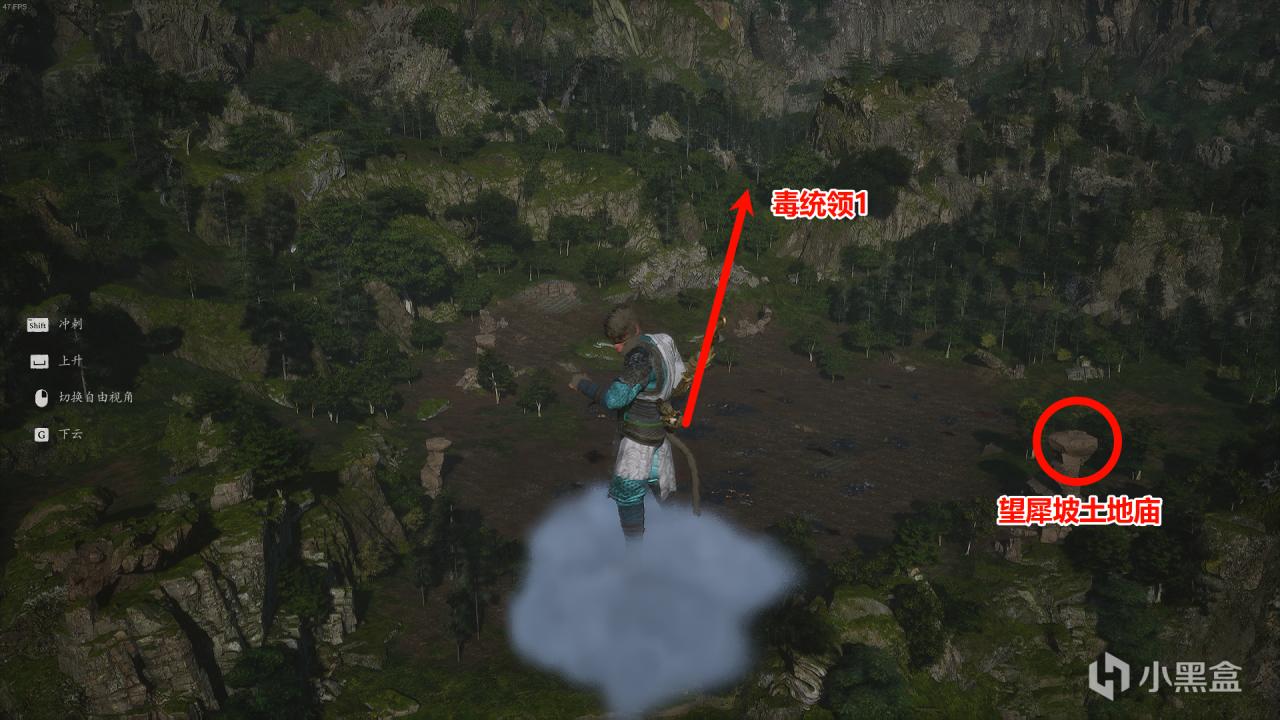 毒統領1:打完浪波波原地起飛,看向望犀坡。往箭頭指向飛,一直到遠處山邊,能看到一塊空地,中間有塊石頭,落地靠近觸發毒統領1戰鬥。