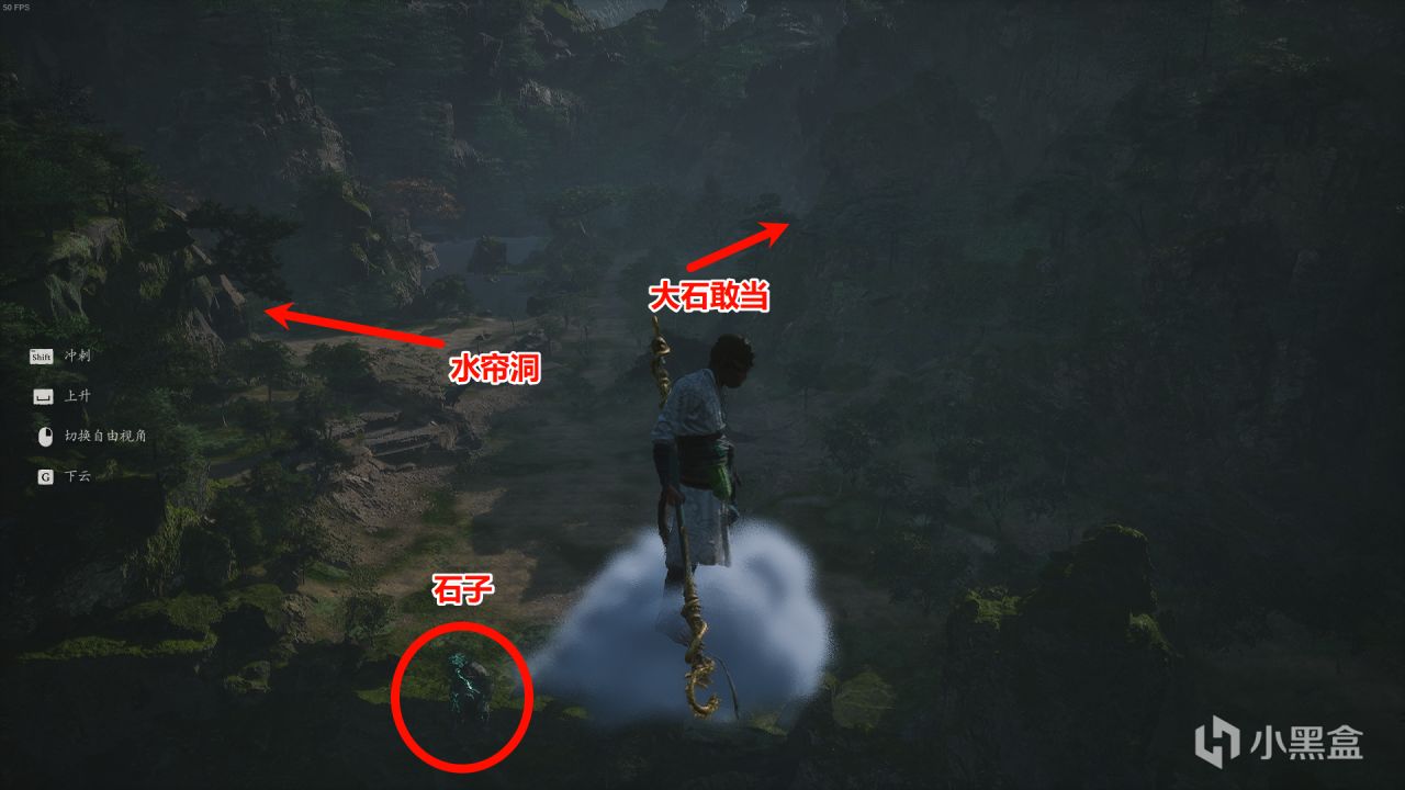 最後飛到石子上方,石子背後左側道路前往水簾洞;石子背後湖邊右側道路則通往BOSS大石敢當。