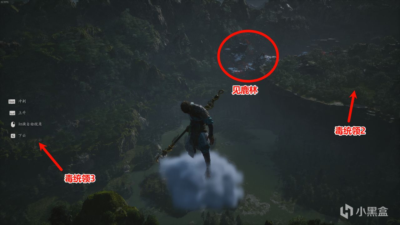 毒統領2、3:回到望犀坡,原地升高看向見鹿林,如下圖。在見鹿林左右兩側高地,箭頭指向的空地處均有一樣的巨石,靠近落地後觸發戰鬥。