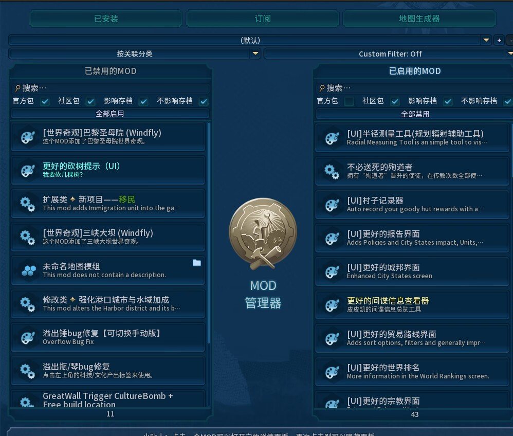 這個mod適合對模組需求量較大的玩家,尤其是遊玩【和而不同】和【黃金時代】等大型模組時所需要搭配的mod是非常多的,以此可以優化分類。同時,它可以將修改類(增加玩家基礎強度等)、增添類(奇觀與領袖等)、作弊類(作弊器等)等各類模組進行有效劃分,非常適合喜歡花裏胡哨的玩家。