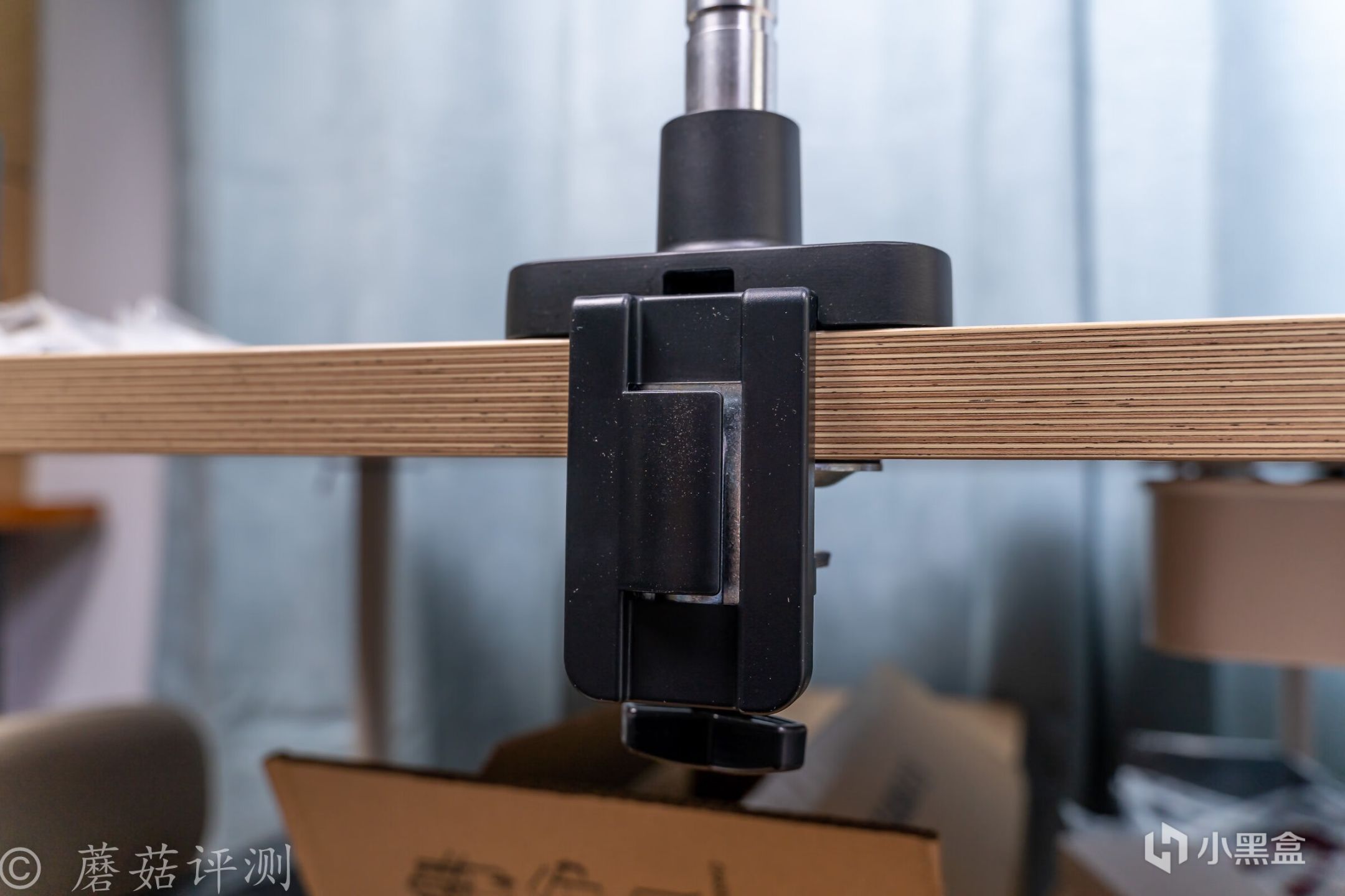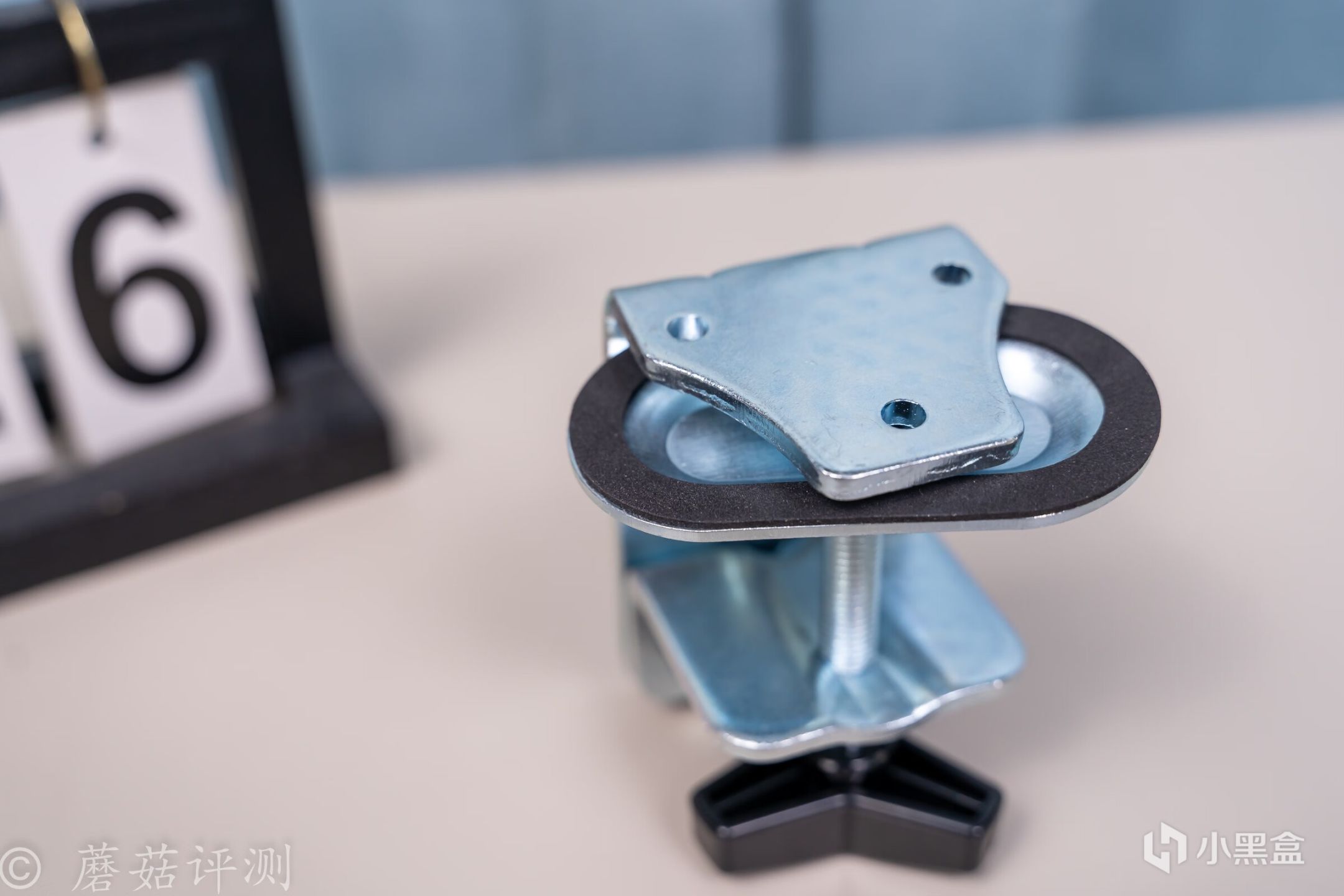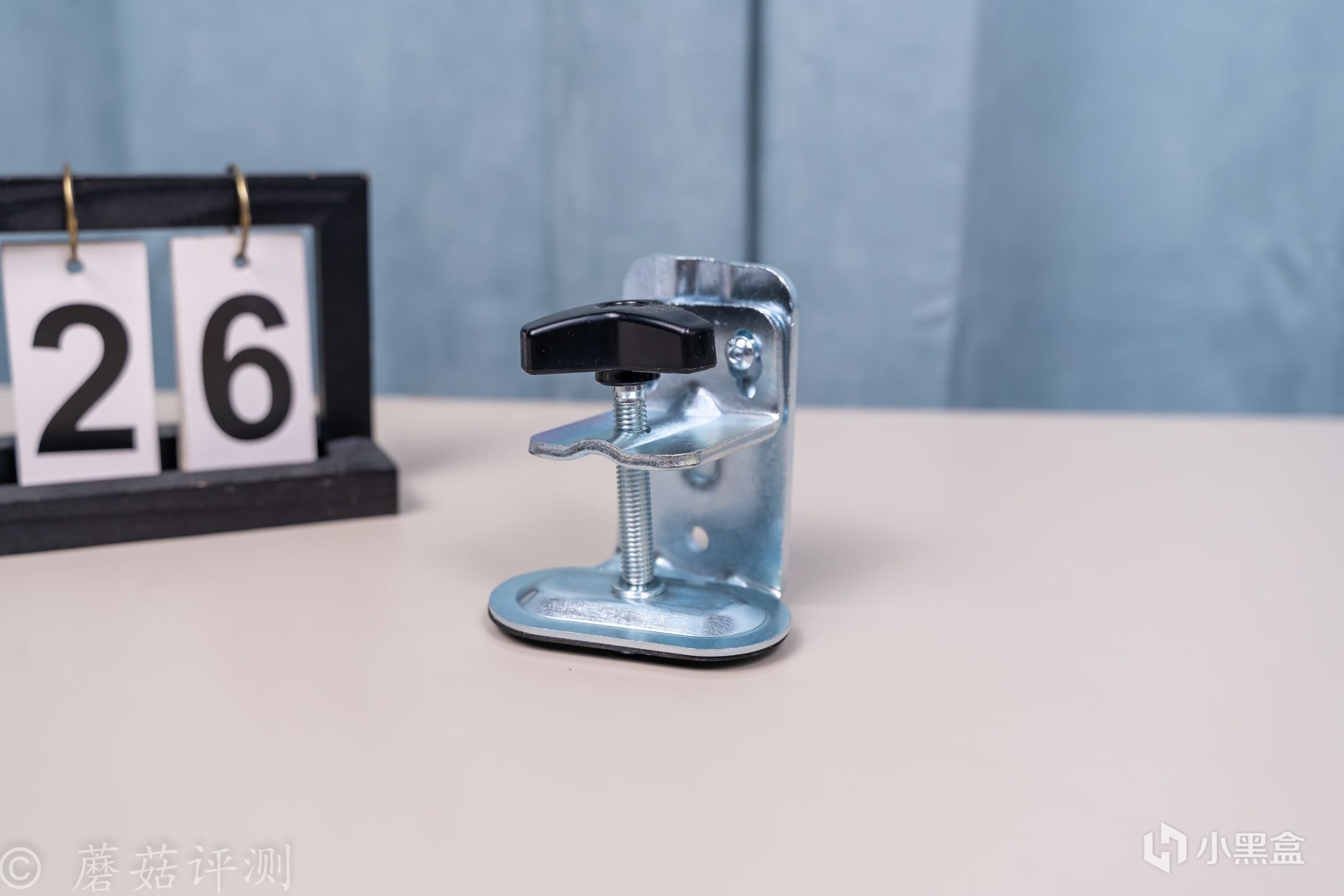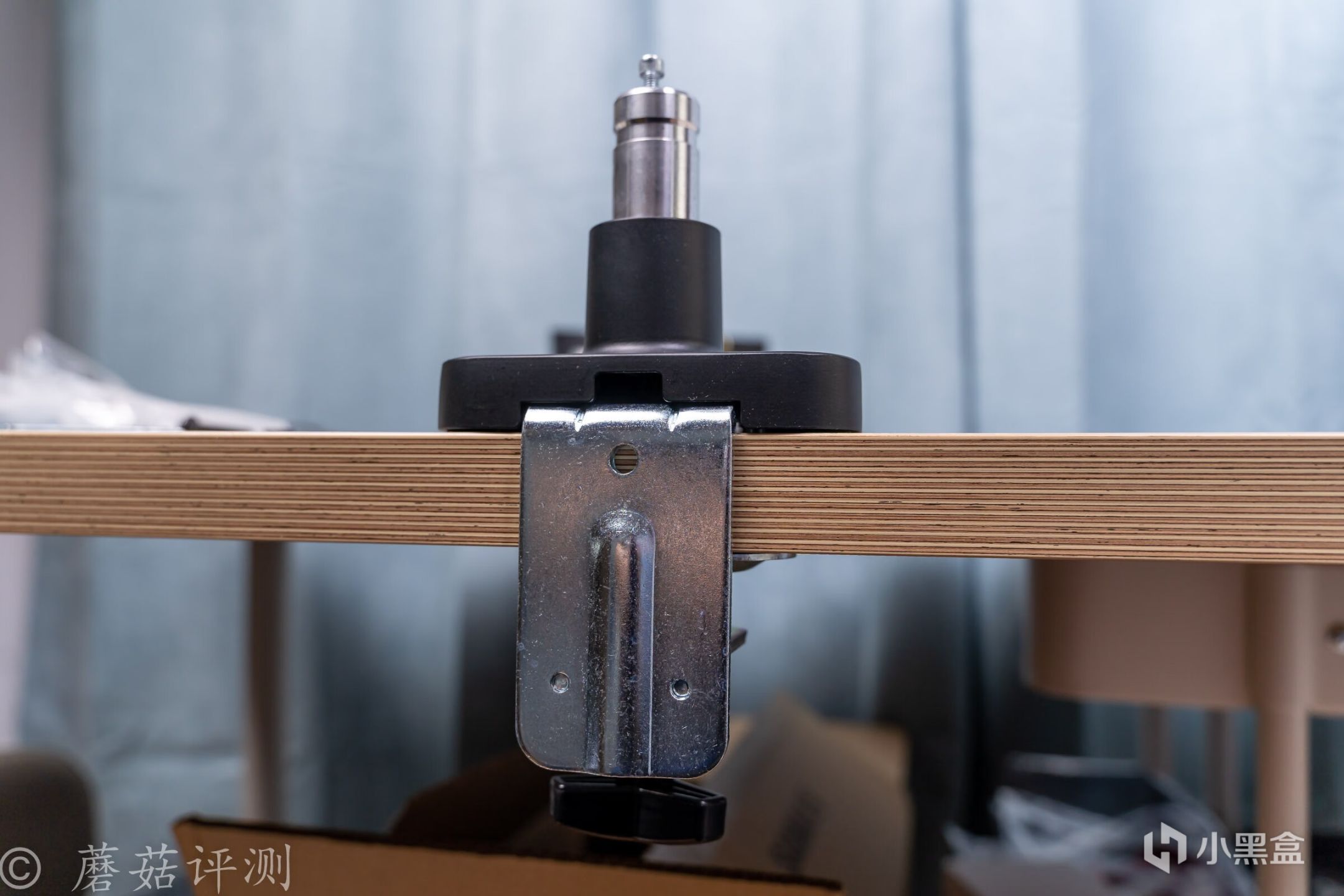 ▼接着直接将夹持件固定到桌面的侧边,稍微拧上一些螺母,带上劲之后多拧几圈,保持足够的力道。