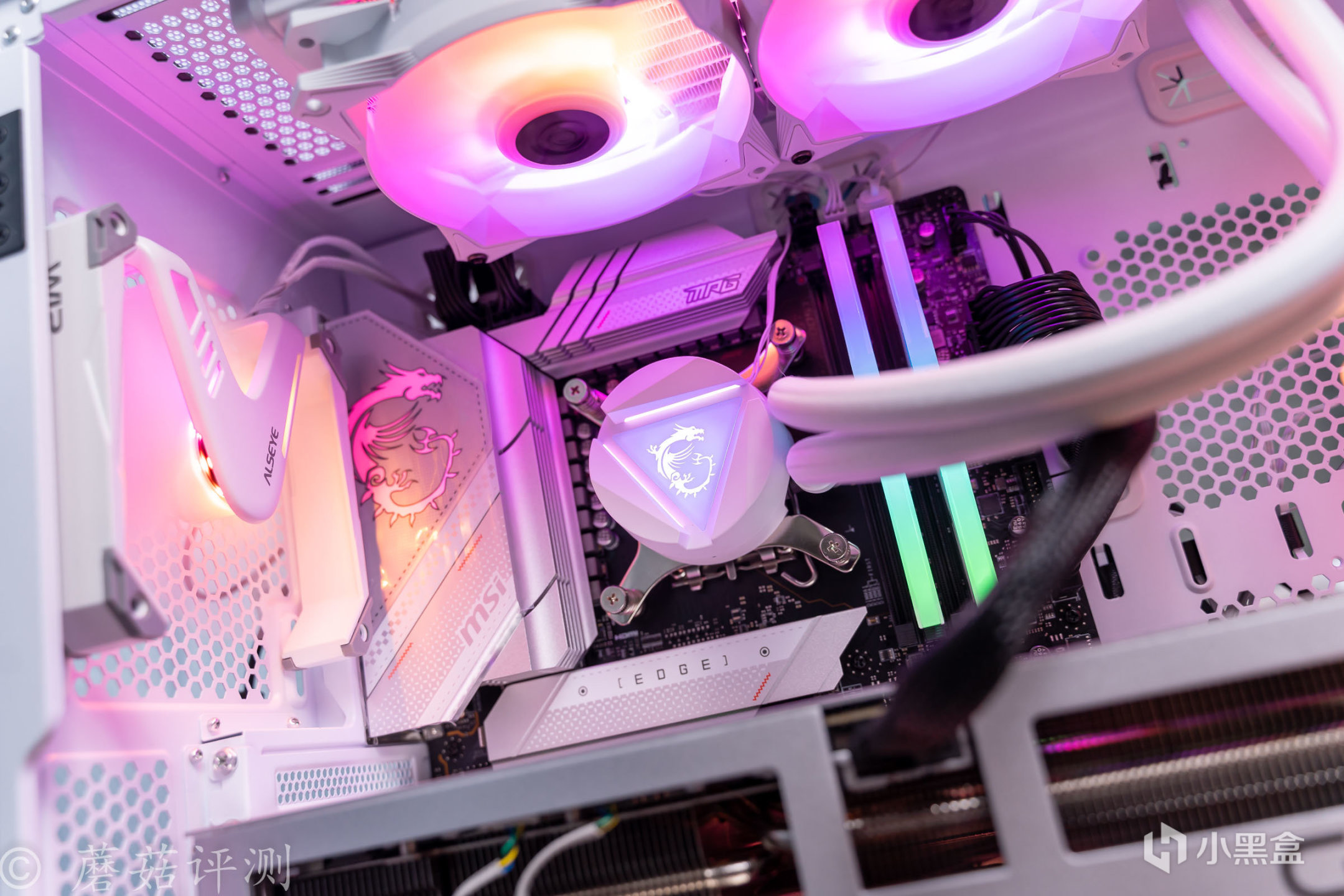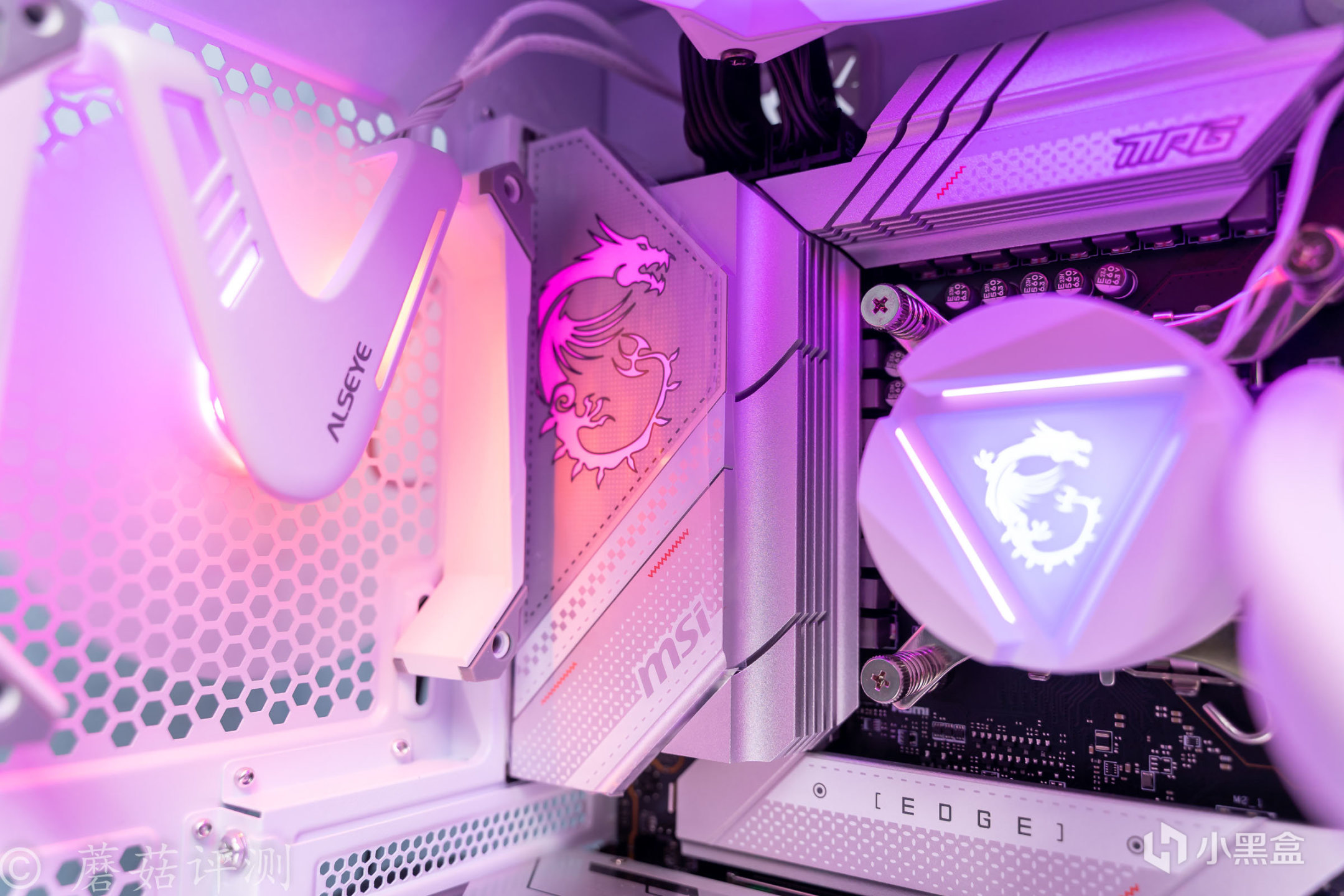 ▼处理器是13600K,用来压制的散热是微星的寒冰240R白色版水冷。水冷的颜值非常漂亮,水冷头的外观设计非常漂亮,中间有经典的微星魔龙LOGO,四周有三角形的造型设计。支持ARGB灯效,支持主板同步。