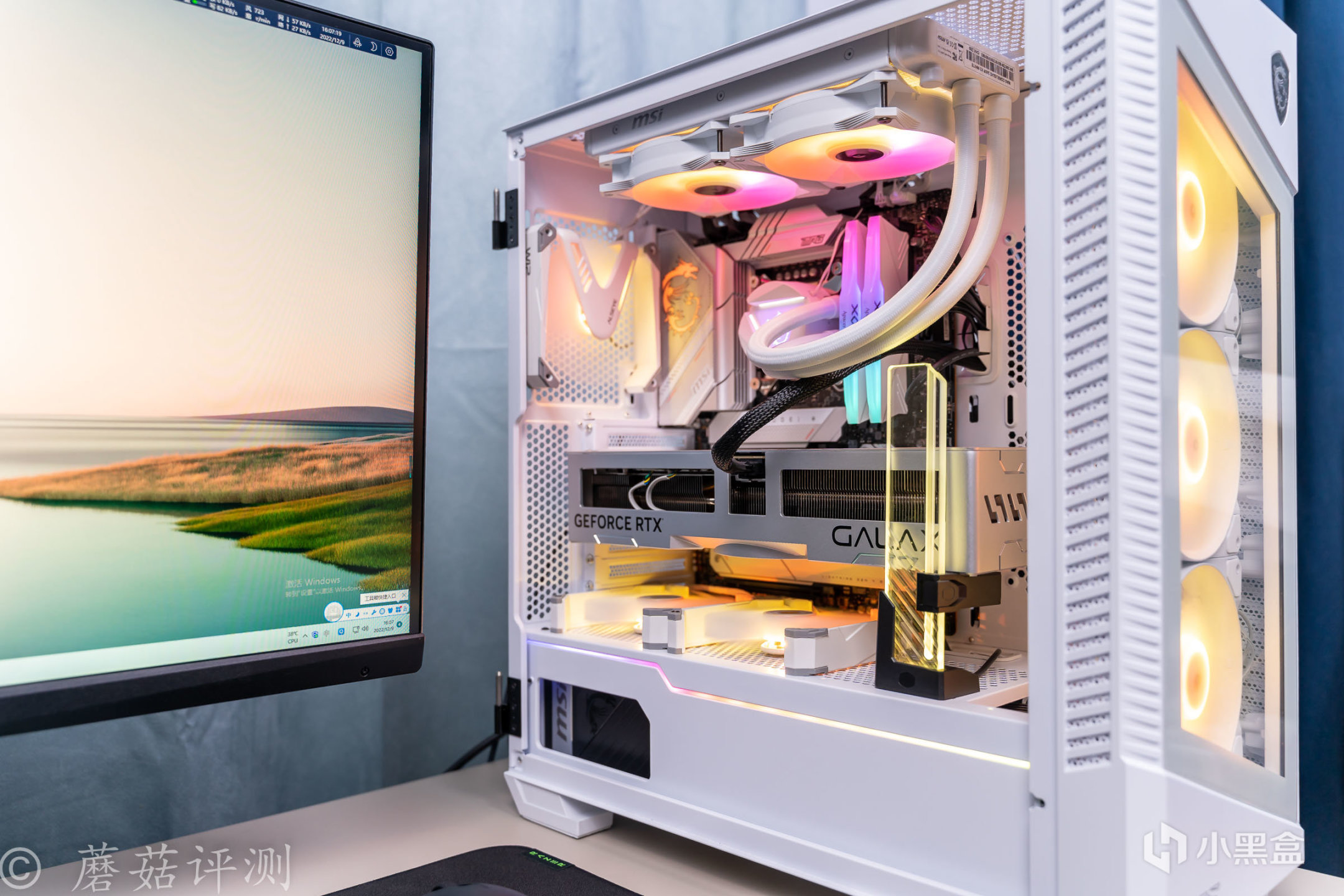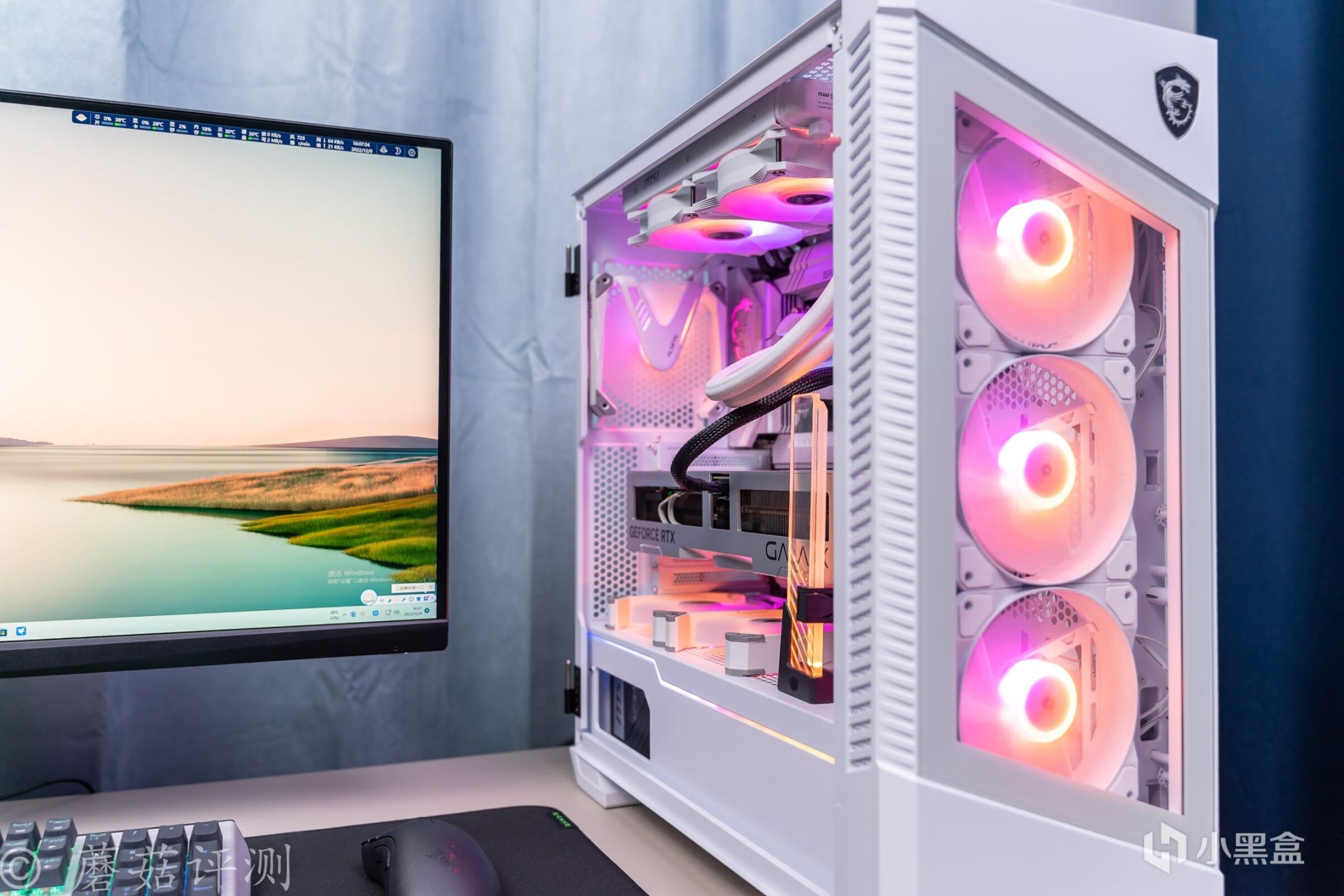 ▼最后是机箱,微星的刀锋100R机箱,白色定制版,颜值非常漂亮。机箱前部标配三把支持ARGB灯效的机箱风扇,可以给机箱内部充足的进风。另外,机箱内部的空间表现很不错,可以轻松支持影驰的RTX4090金属大师OC显卡的安装。