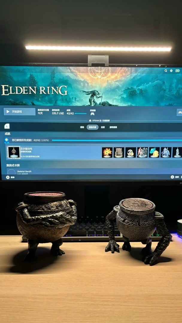 艾爾登法環奇妙地滿足了我的收集癖,所以我花了很多的時間刷掉落,基本上集齊了所有的武器和防具。在全成就的那一刻非常開心,跟兩個壺哥共同慶祝。