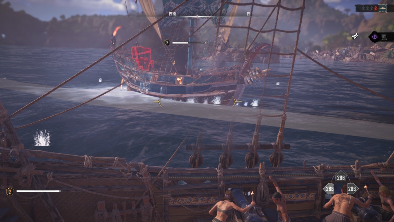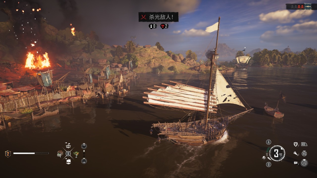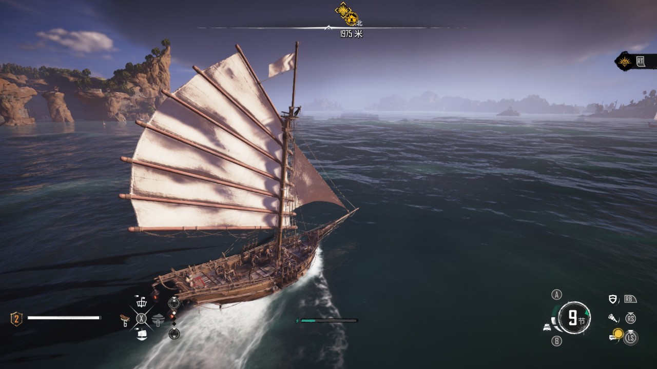 操作方面我是通過手柄遊玩,操作上比較簡單,左下角的白條爲血量,旁邊是一些修理艦船的修復工具以及用以提升各種士氣的食物(可以在營地通過烹飪獲得)。右下角則是艦船的航速,用“節”來表示,由於是風帆戰艦,我們的風帆在拉滿航速的情況下是有耐久值的。並且在順風情況下快,逆風就會慢,風暴情況下也會比較危險,這一點還需要注意。