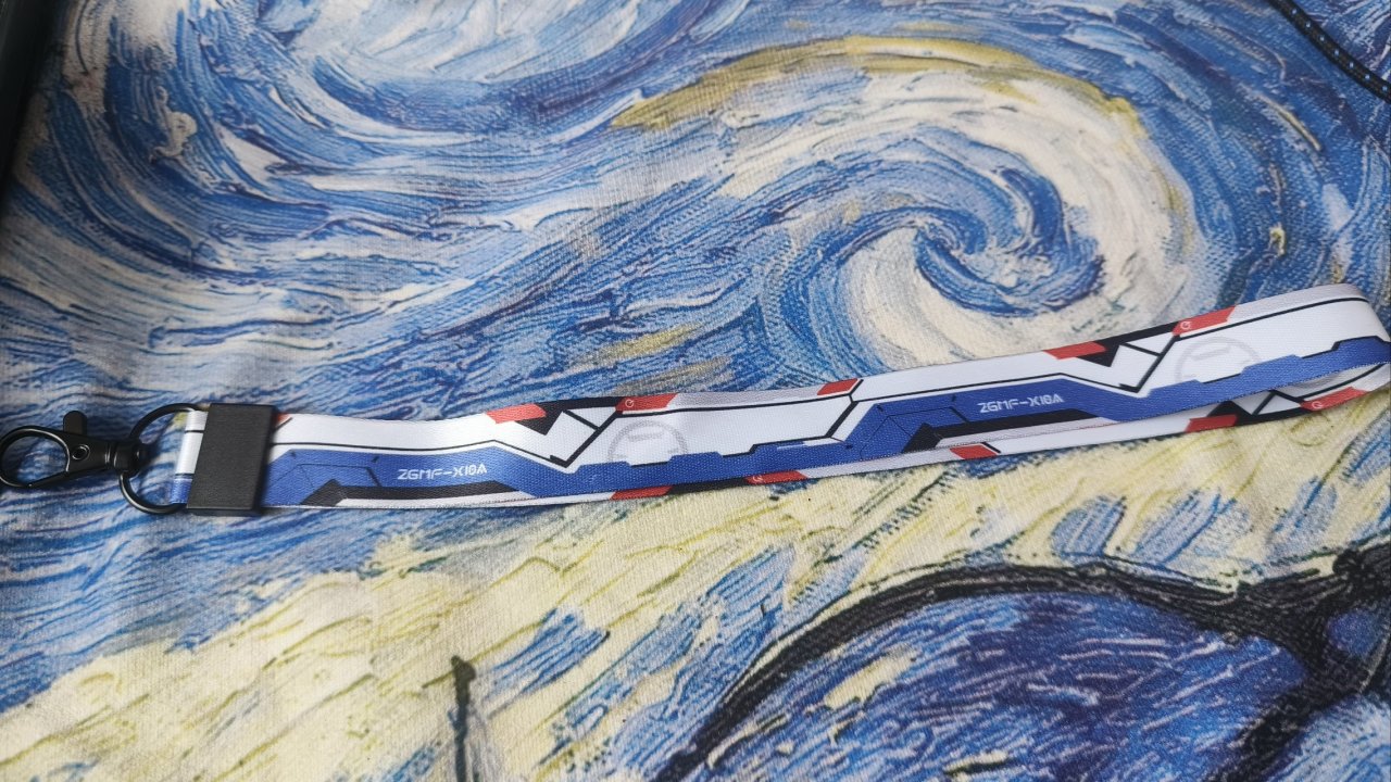 首先是這個帶子,這是幹嘛的呀?我找不到可以讓他掛的地方,一開始我以爲它是掛手柄的,可是手柄上也沒孔啊。不過這個藍白色的設計真是帥呆了。我感覺自己就是高達駕駛員,戴上屬於我的小牌牌,用來上吊都有逼格。