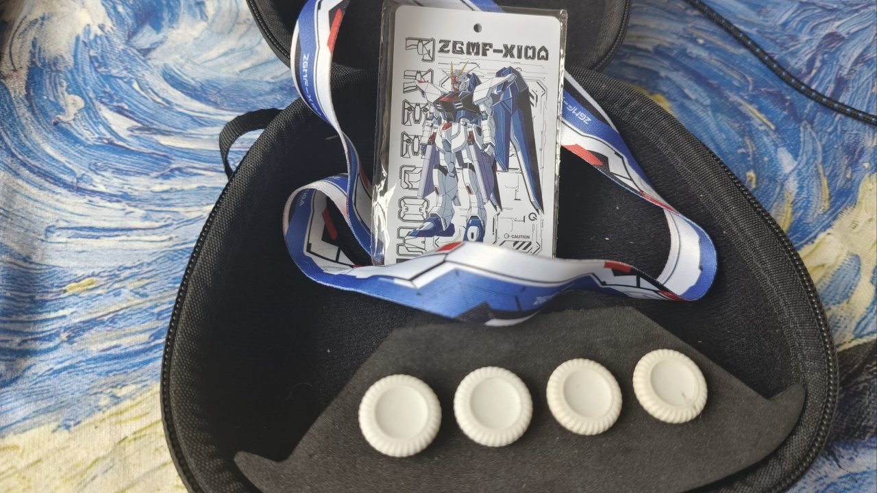 是不是超級乾淨了,然後我們看看都有什麼配件,包括一個包,兩套替換搖桿,一個支架,一個帶子,一個硬質高達卡片,沒有數據線。